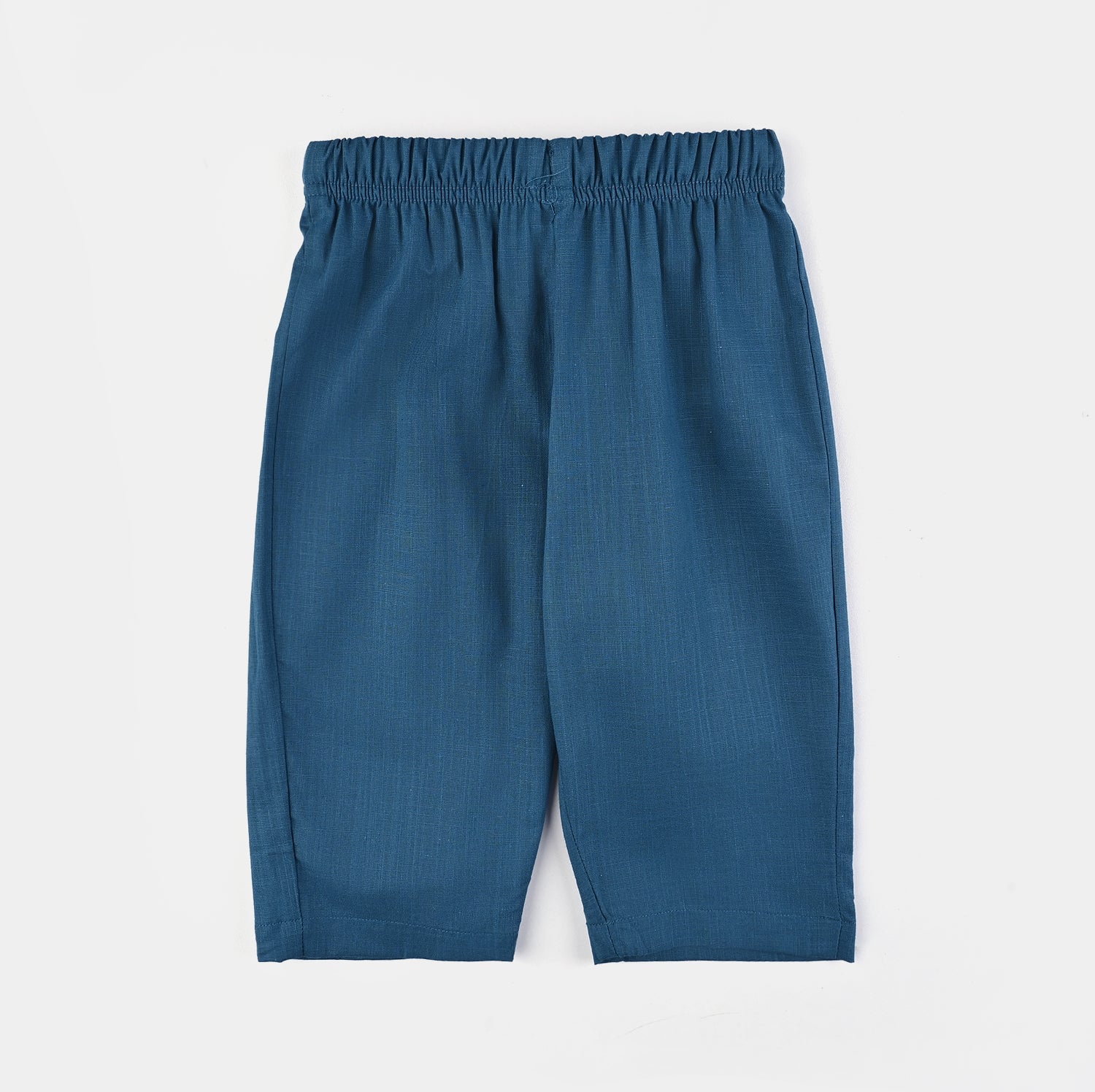 This Infant Boys Cotton Slub 3-Piece Suit in Teal is expertly crafted for special occasions. Featuring a plain cotton slub kameez and shalwar, it ensures comfort and breathability for your baby. The standout embroidered waistcoat, accented with a subtle yellow puff motif, adds a sophisticated detail to complete an elegant yet comfortable outfit.