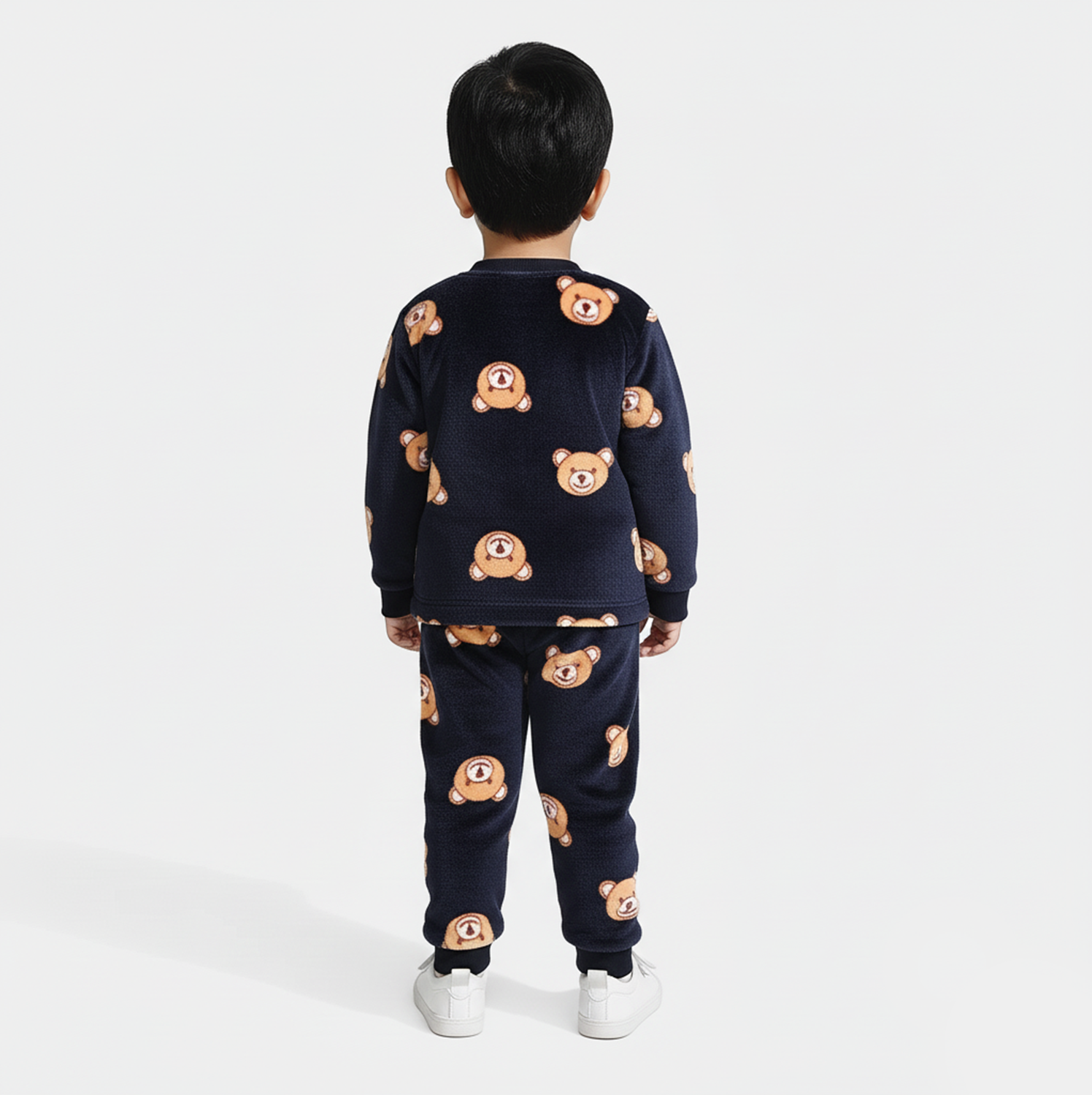 Snuggle-ready cuteness. This navy sherpa suit with playful bear prints wraps your little one in warmth and softness, making it perfect for cozy adventures.