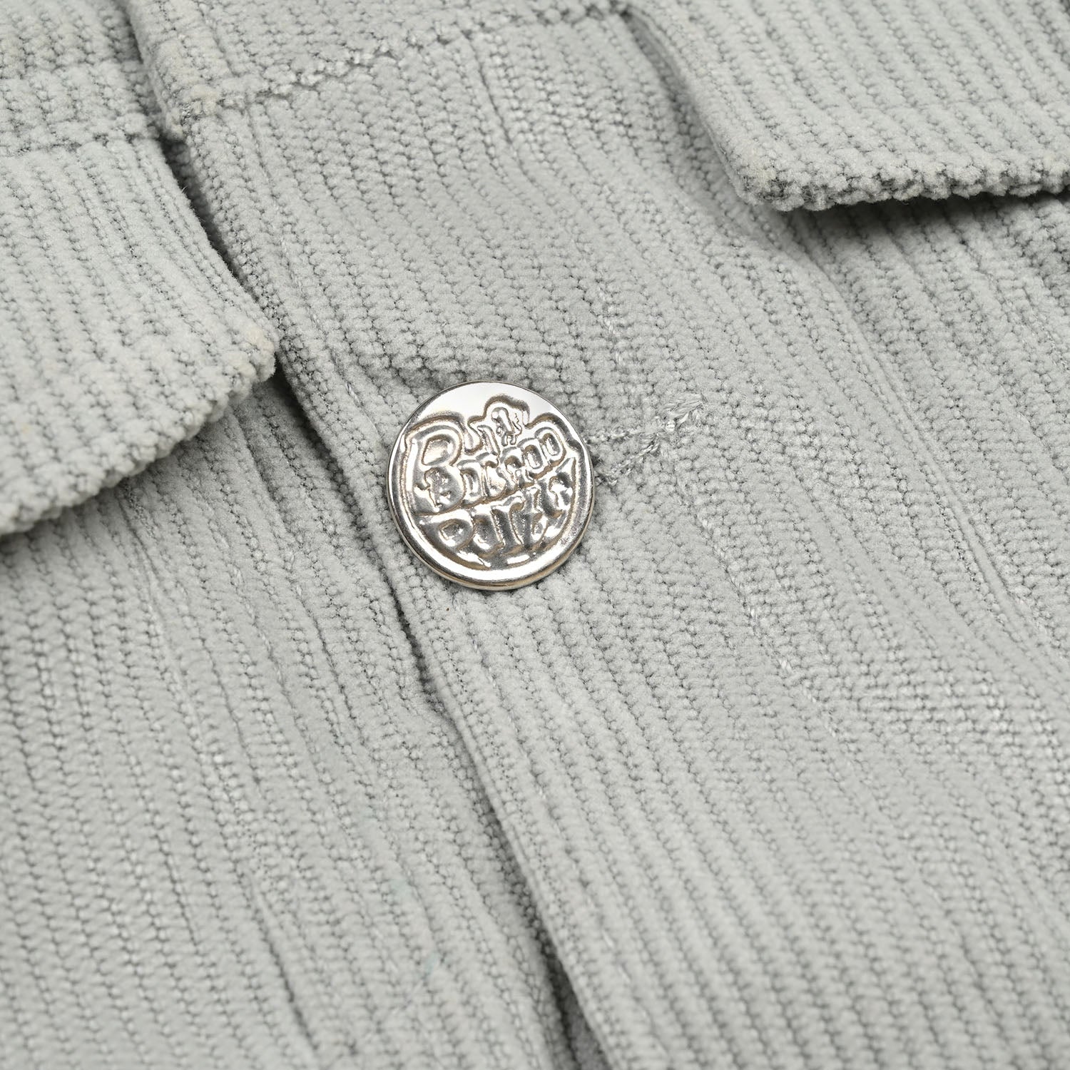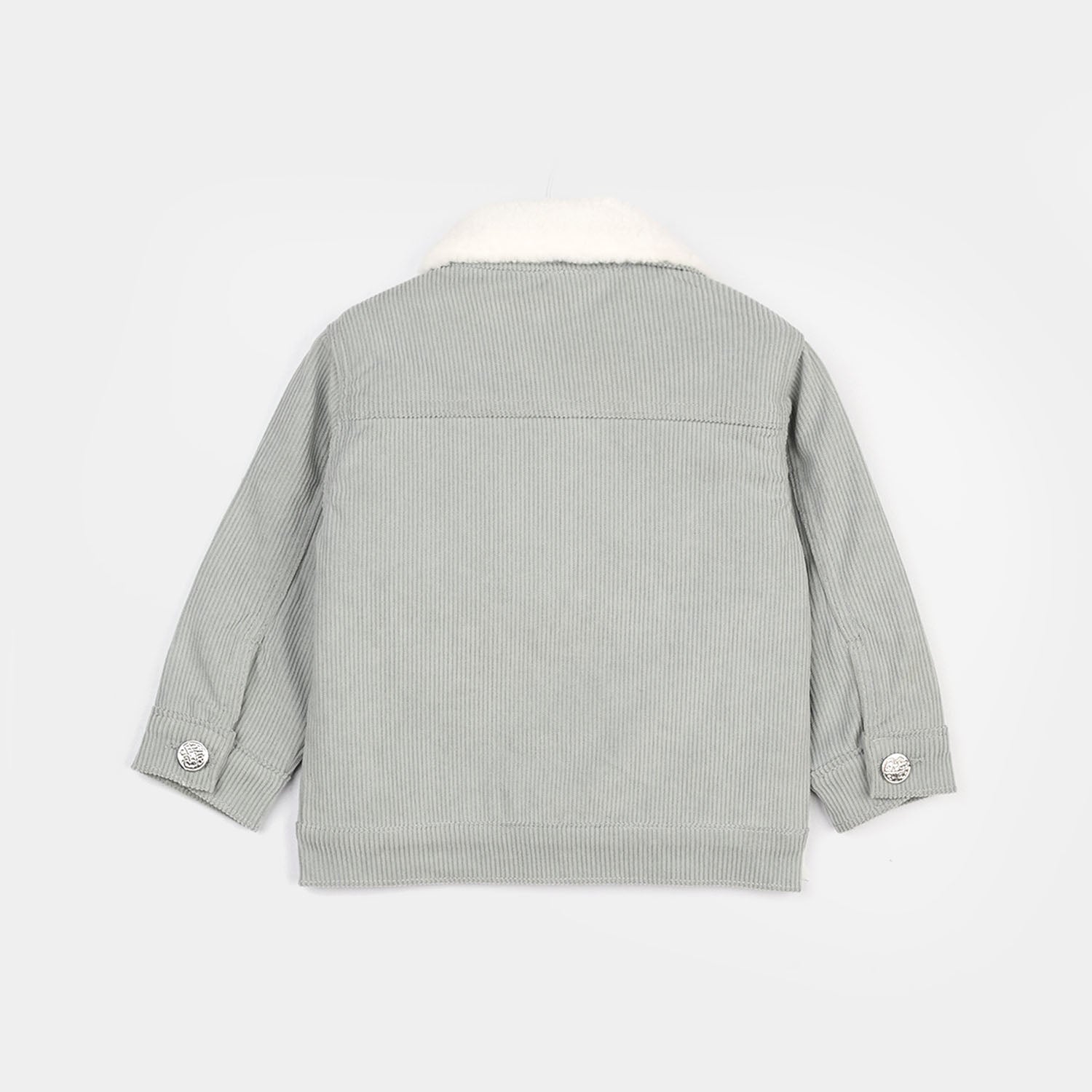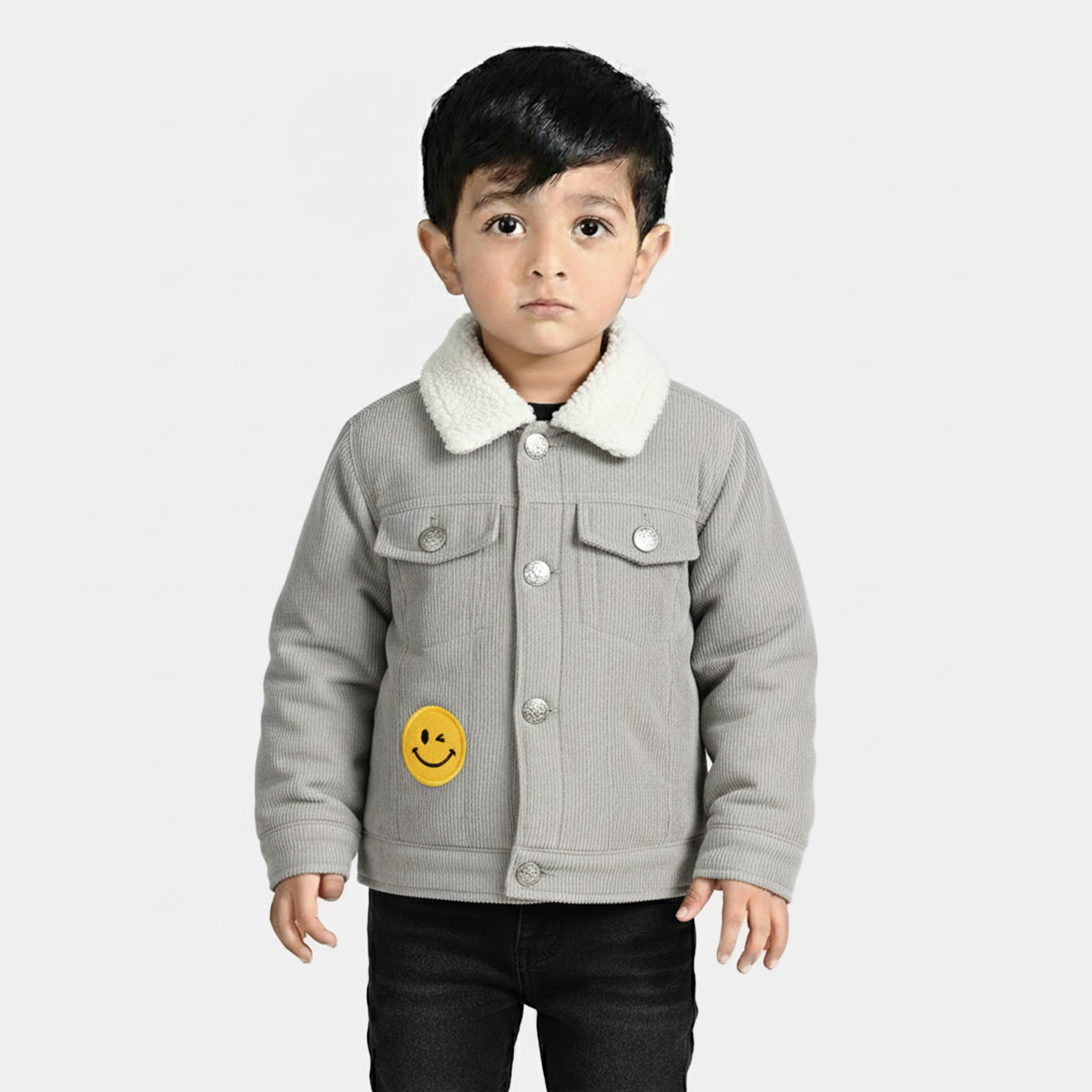 This grey corduroy jacket features a soft white furry collar, full sleeves, front pockets, and a yellow smiley embellishment, making it a cozy and stylish layering piece.