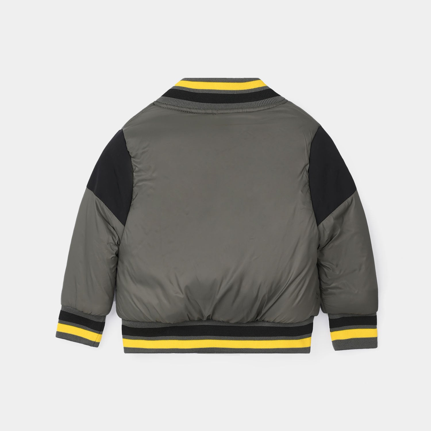 This green boys quilted jacket features a button-front closure, full sleeves with hem detailing, pockets, and a fun dinosaur theme.