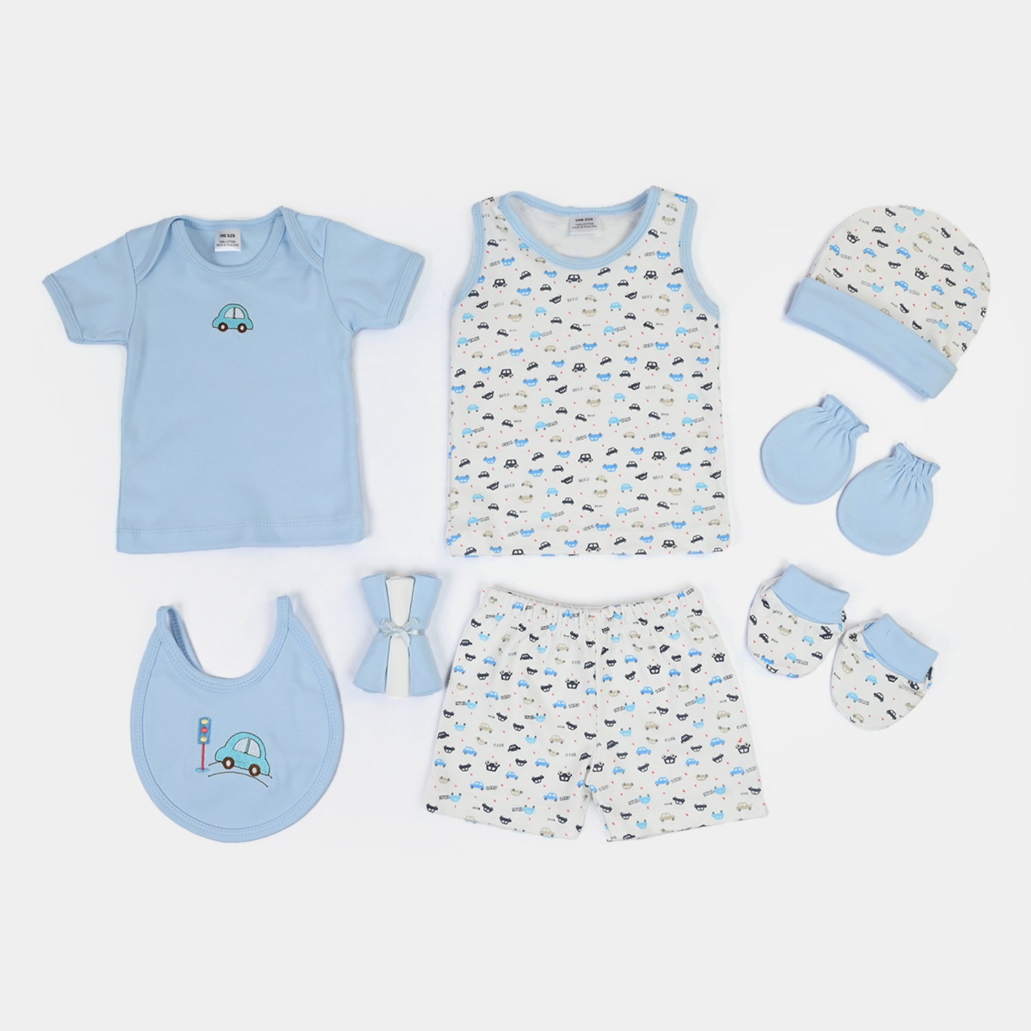 T-shirt, Sando, mittens, pajamas, cap, bib, socks, and face towel. |