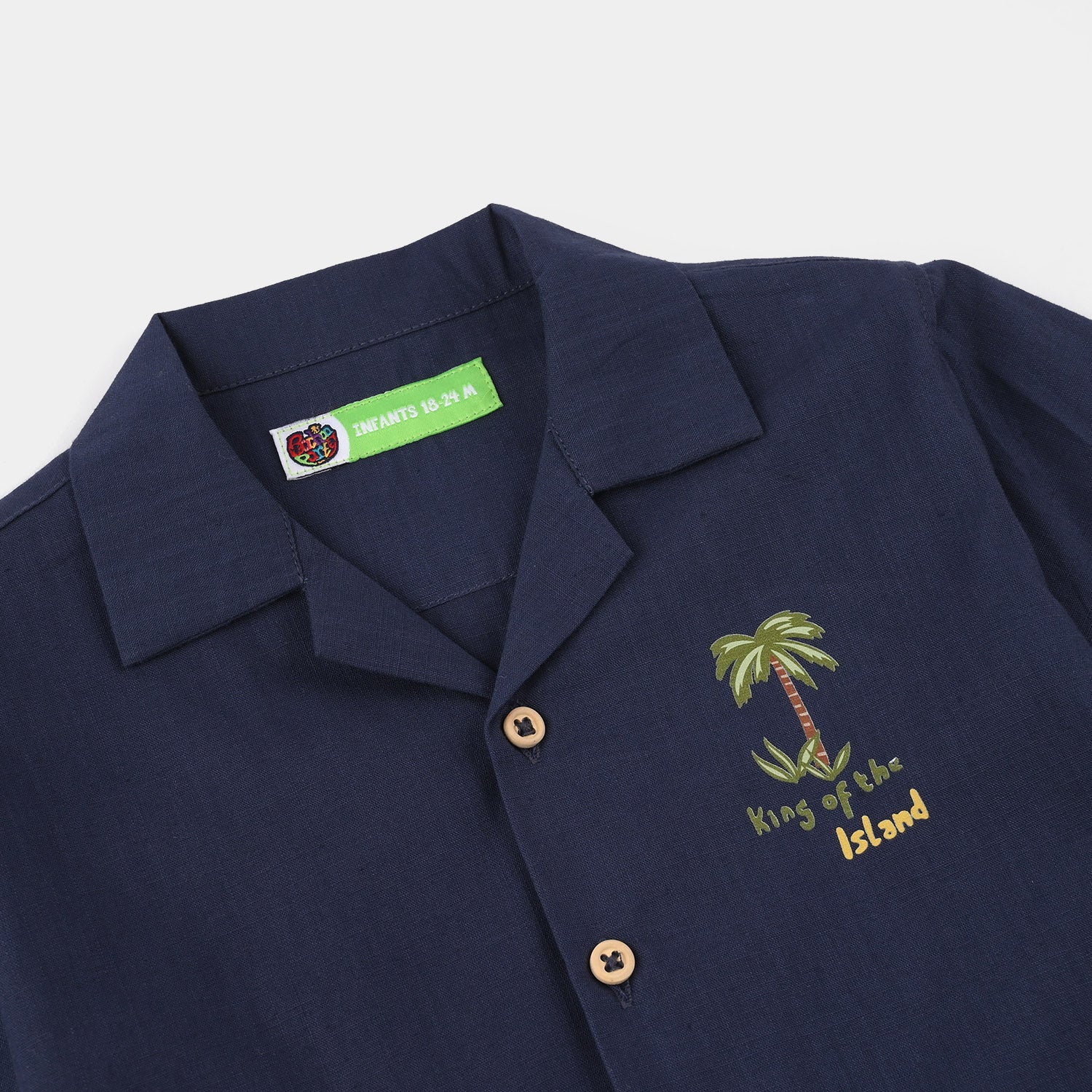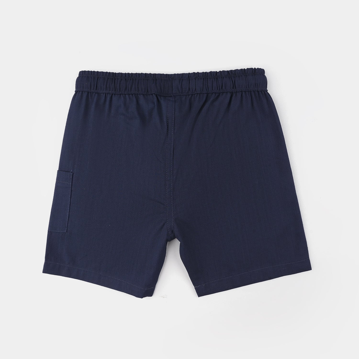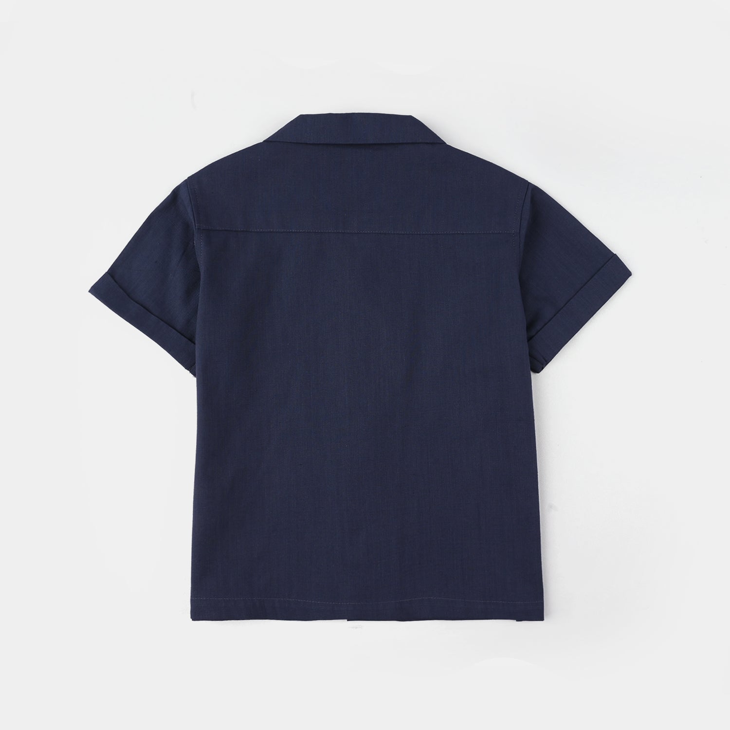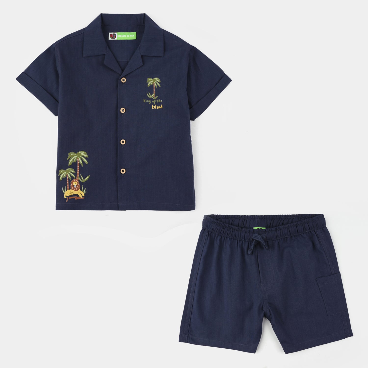 Infant boys' navy cotton slub woven suit featuring a front-open half-sleeve shirt with matching shorts, perfect for a comfortable and stylish everyday or casual look.