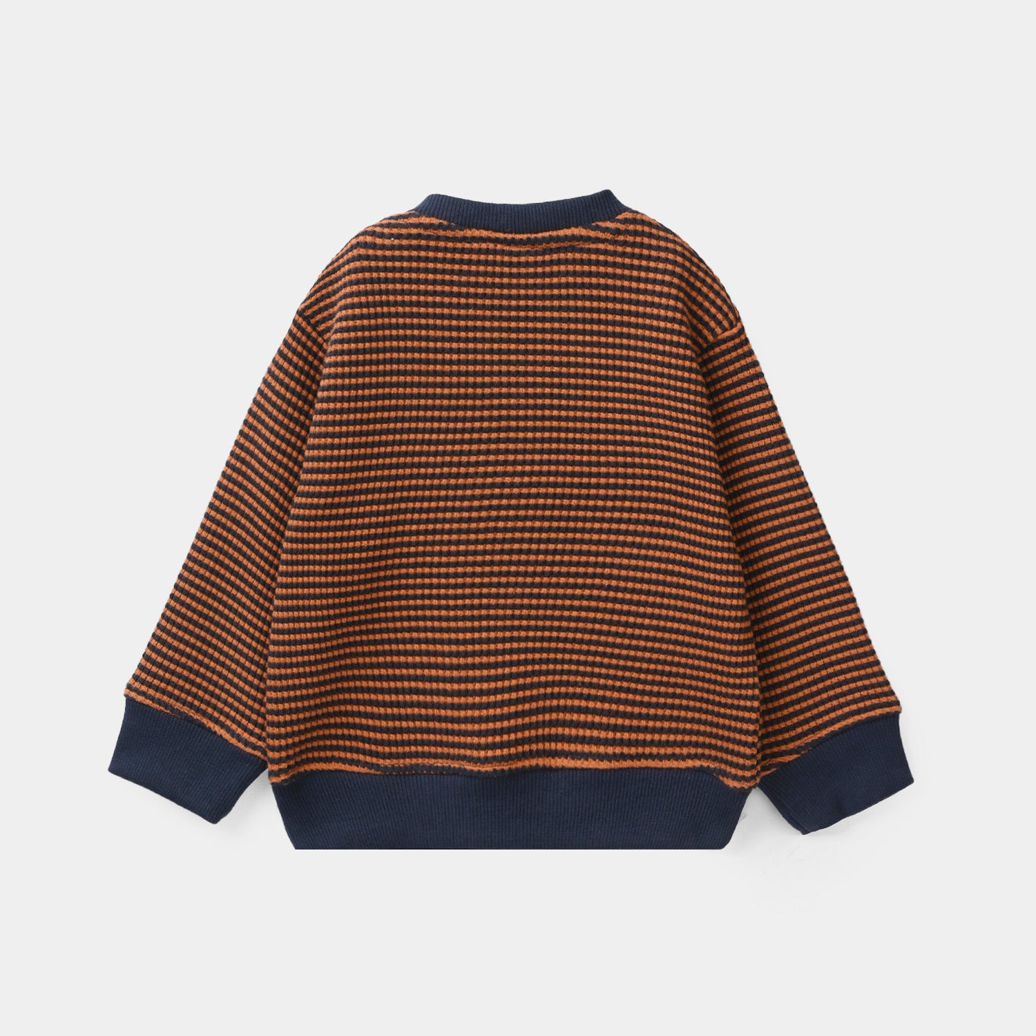 Infant boys' brown jacquard suit featuring a full-sleeve shirt with elegant jacquard stripe detailing and matching bottoms.