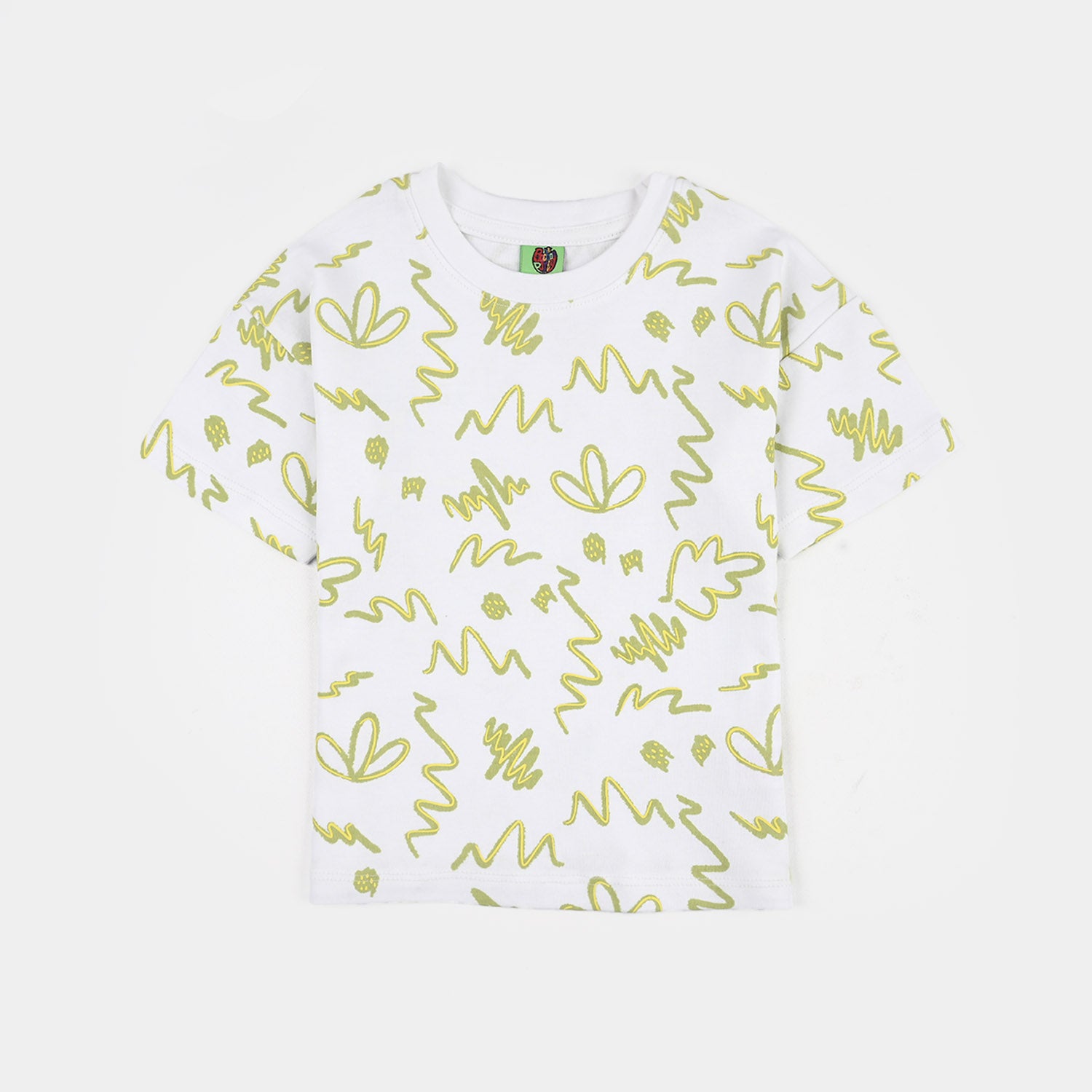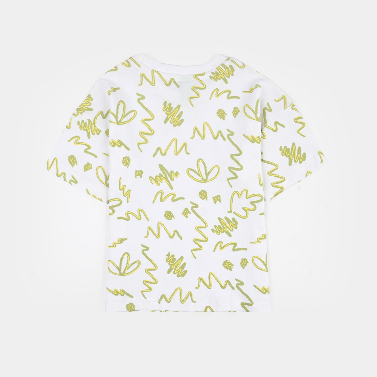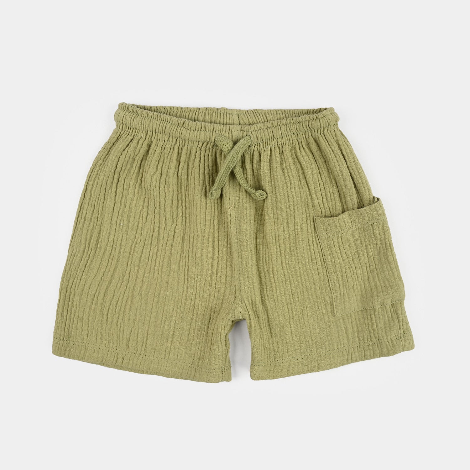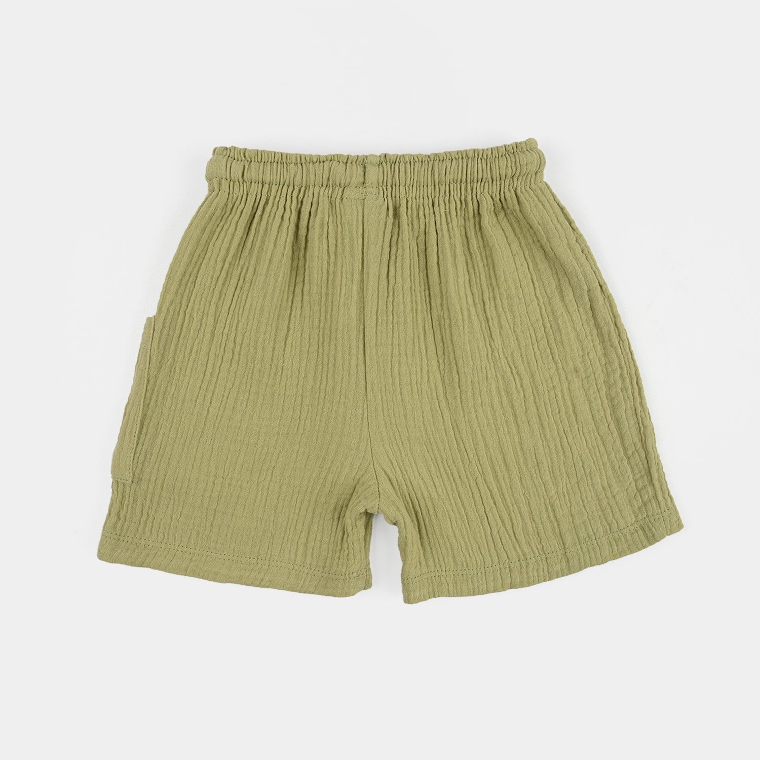 Infant boys' white and green knitted suit featuring a round-neck, half-sleeve top, paired with contrast shorts with a pocket, perfect for a cute and comfortable everyday look.