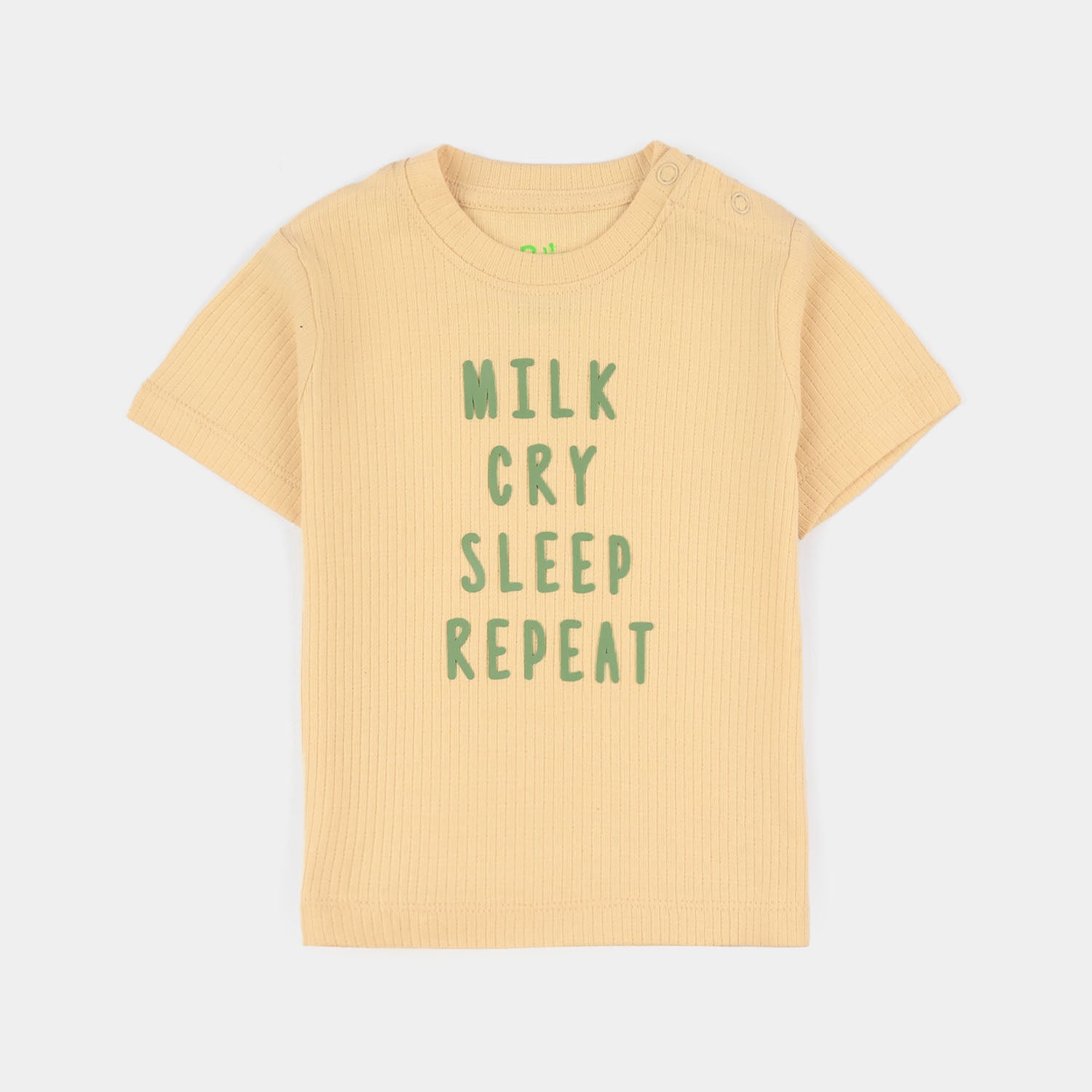 Infant boys’ yarn-dyed suit in yellow and green featuring a round-neck half-sleeve shirt with front text and contrasting green shorts, perfect for a smart and comfortable everyday look.