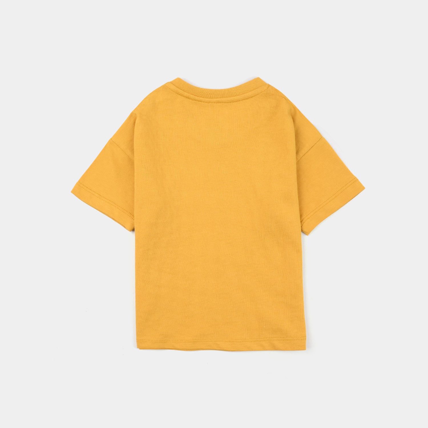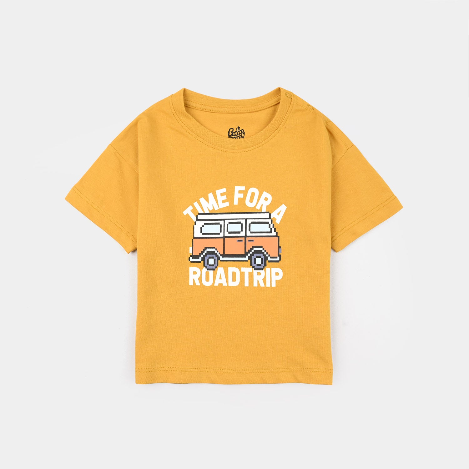 Infant boys’ jersey/terry T-shirt in yellow, featuring a round neck, half sleeves, and a “Road Trip” front graphic.