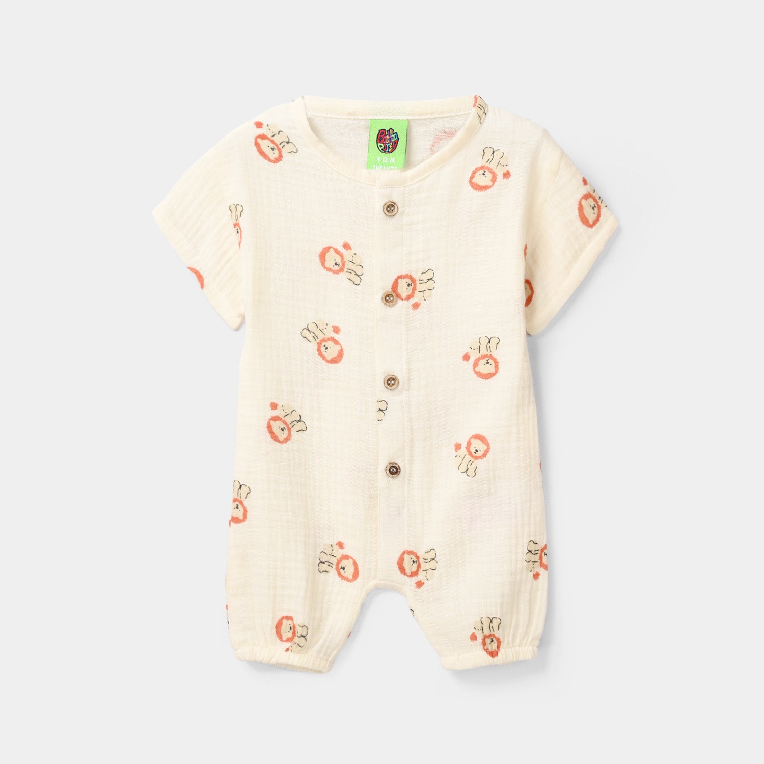 Infant boys lion-printed romper in off-white designed for a cute summer look. Features a round-neck, front-opening style with half sleeves for comfort and easy wear.