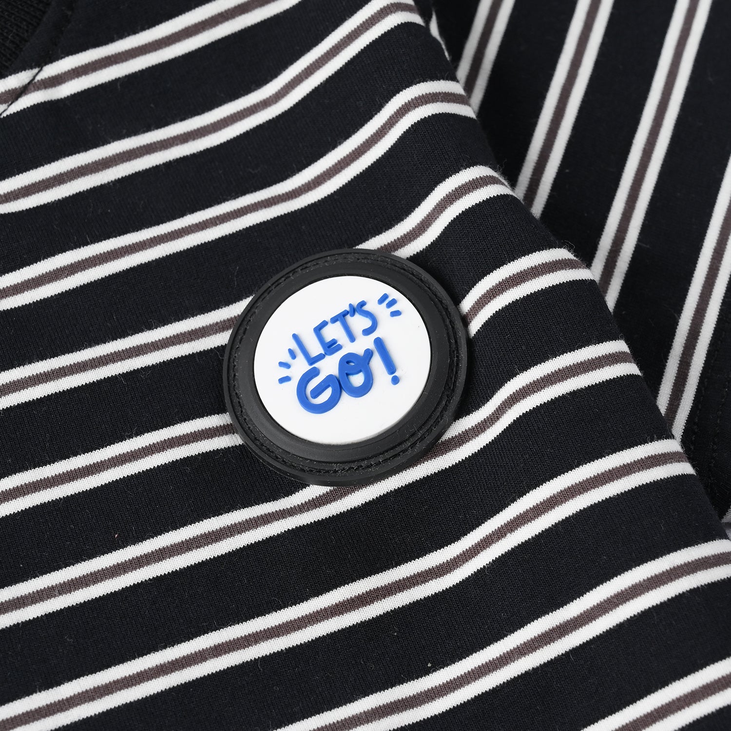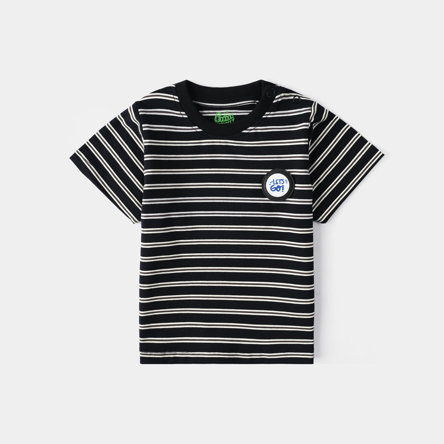Infant boys’ black yarn-dyed T-shirt with round neck, half sleeves, striped pattern, and “Lets Go” text embellishment for a casual look.