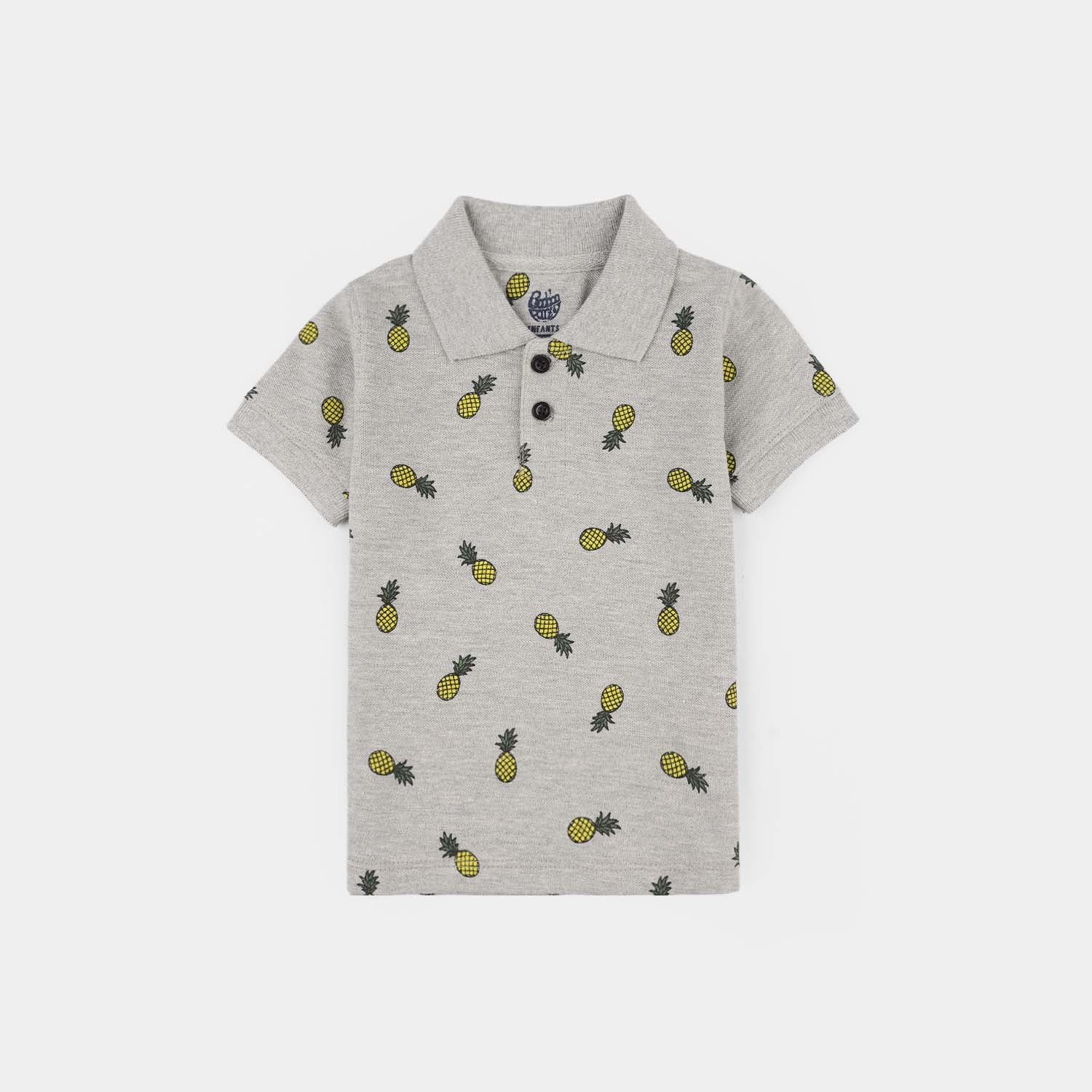 This grey cotton PK polo for infant boys features half sleeves and an all-over pineapple print, perfect for a smart and comfortable everyday look.