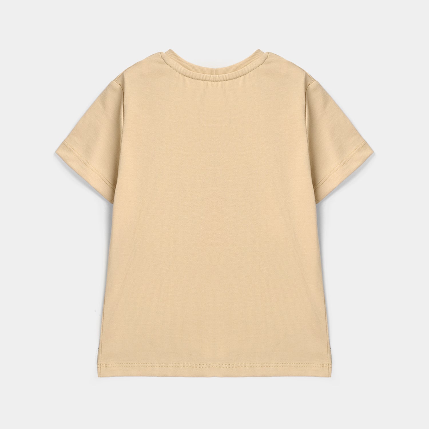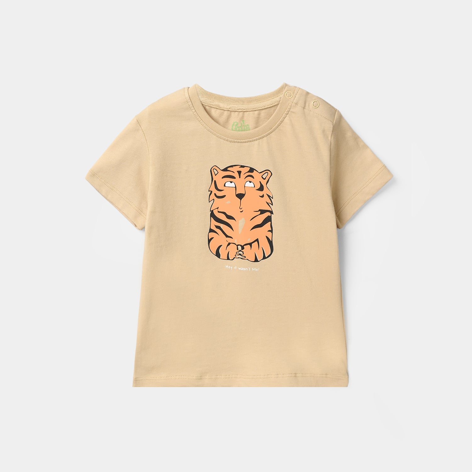 Boys tiger-printed T-shirt in a warm sand color featuring half sleeves, perfect for a casual and comfortable everyday look.