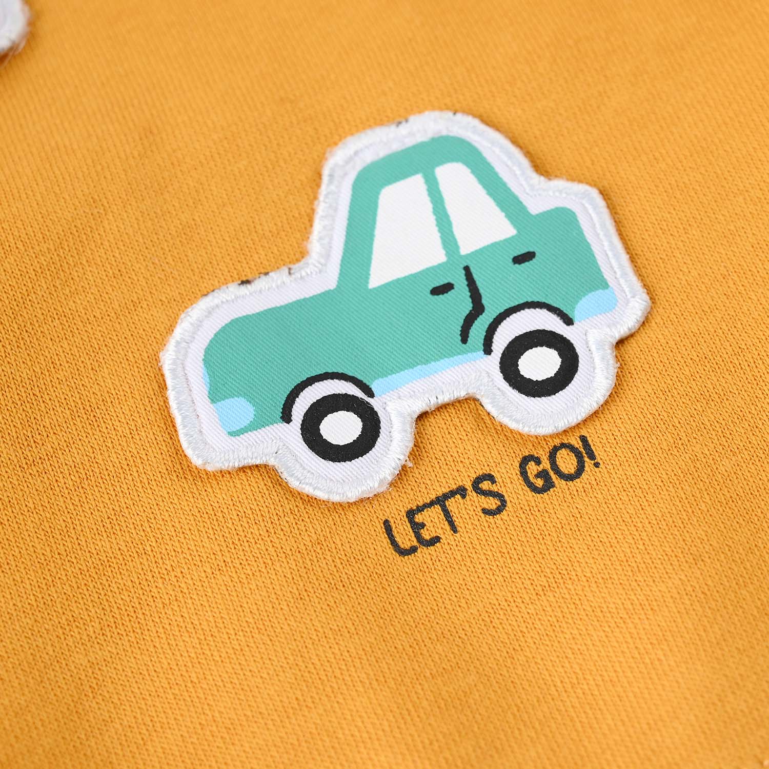 This yellow boys 2-piece set features car embroidery on the front, a round neck, full sleeves, and matching bottoms with a hem for a coordinated look.