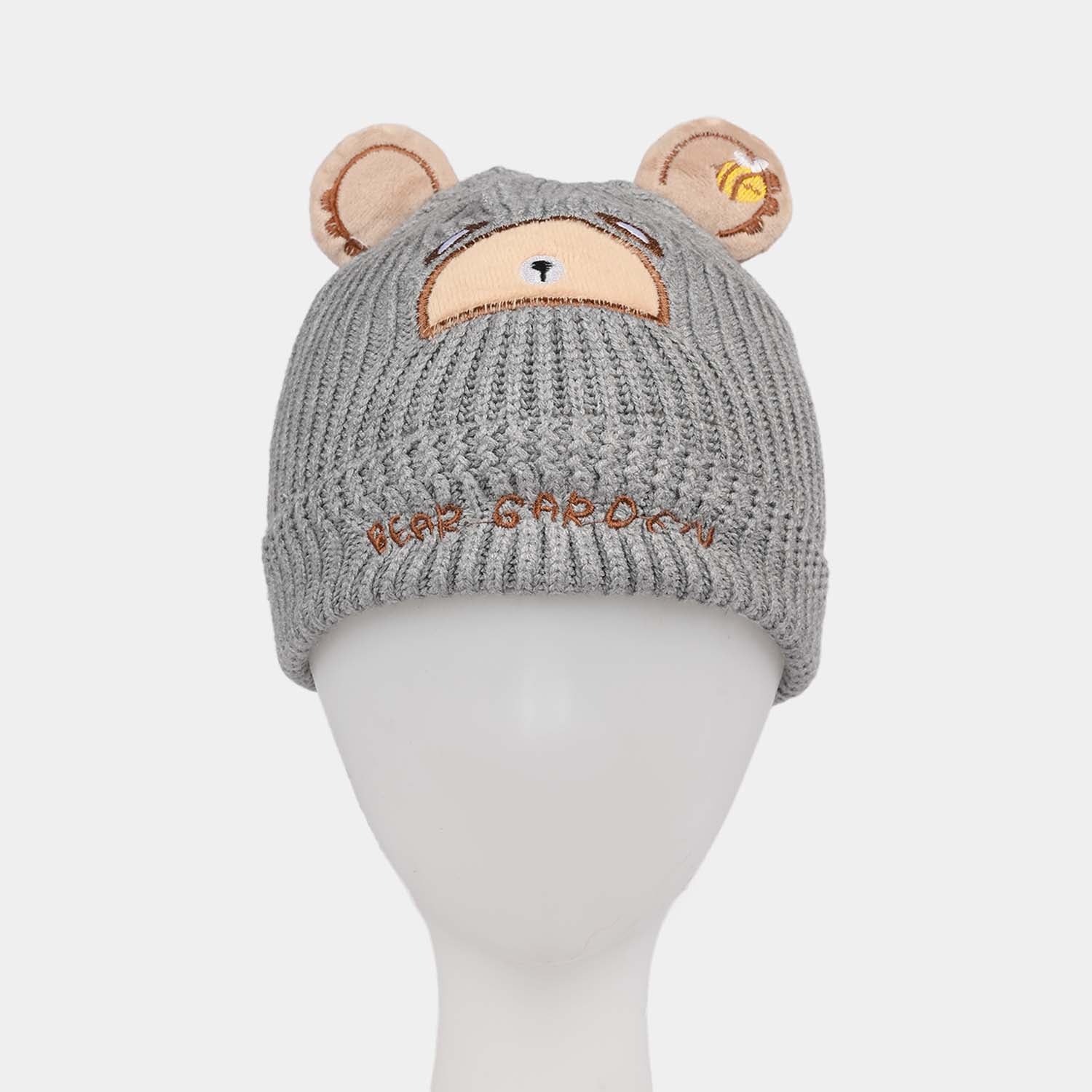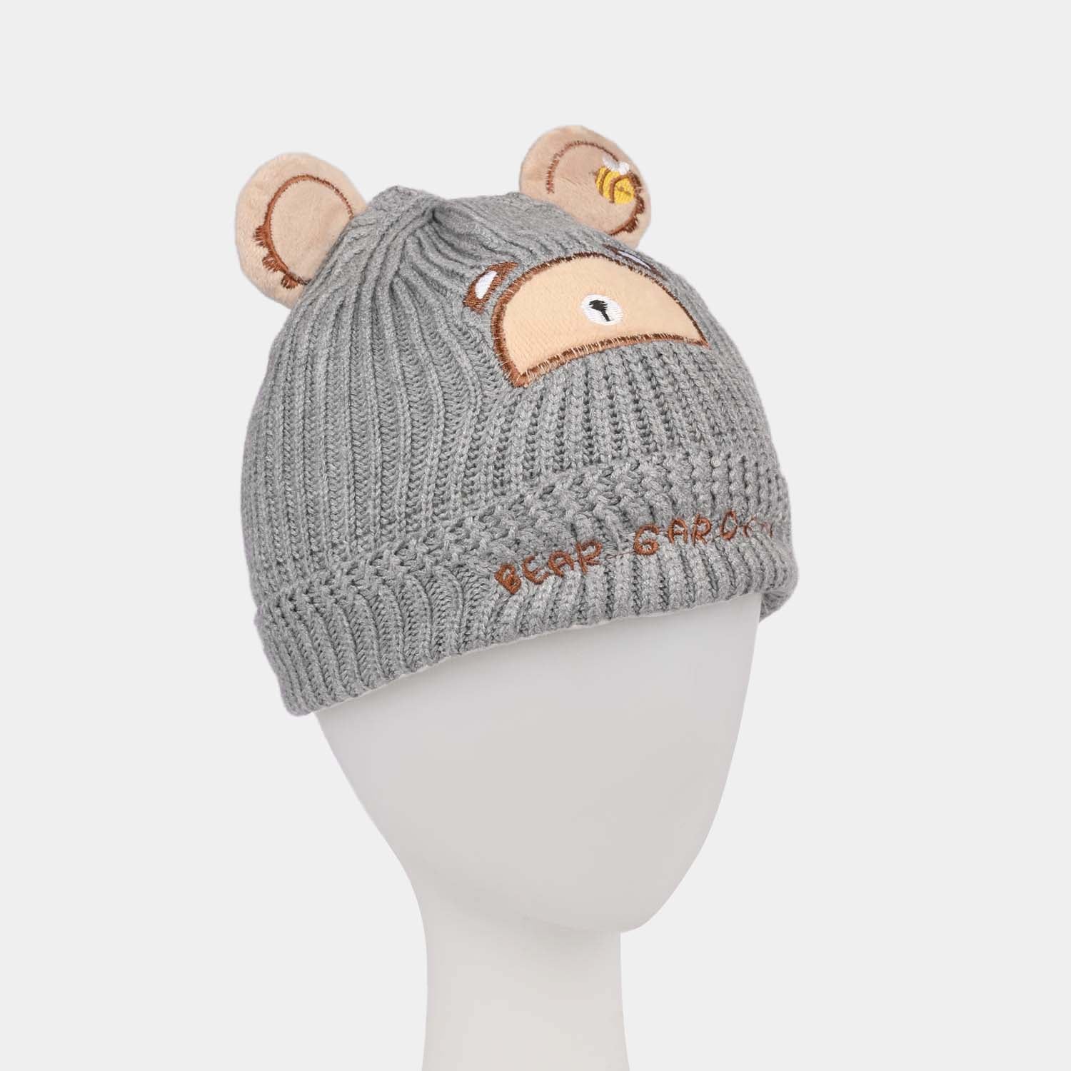 Keep your little one cozy with this grey woolen cap featuring a cute bear face and bear ears, perfect for cooler days.