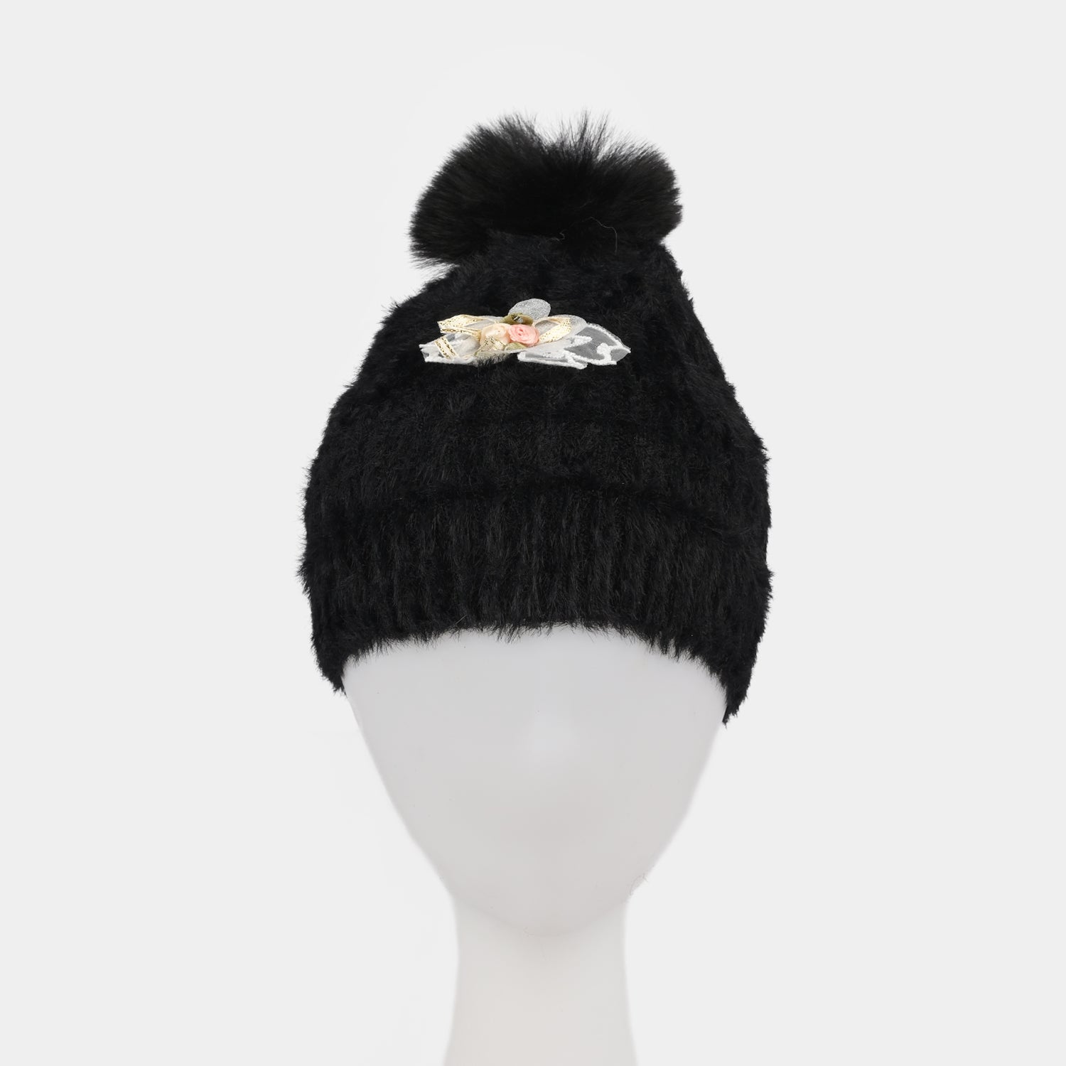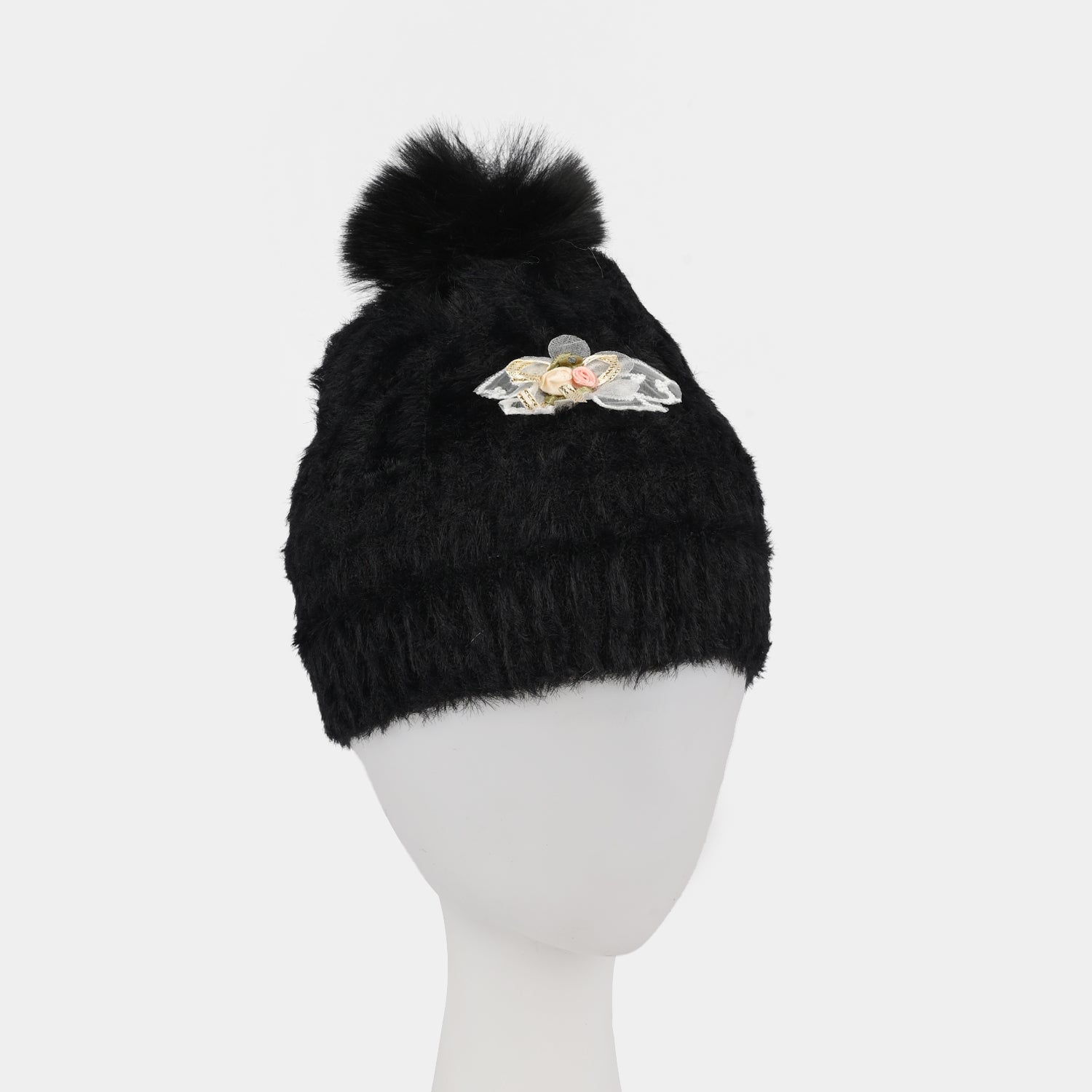 This cozy black winter accessory features a flower and pom-pom on top, combining a cute and stylish design for a fun look.