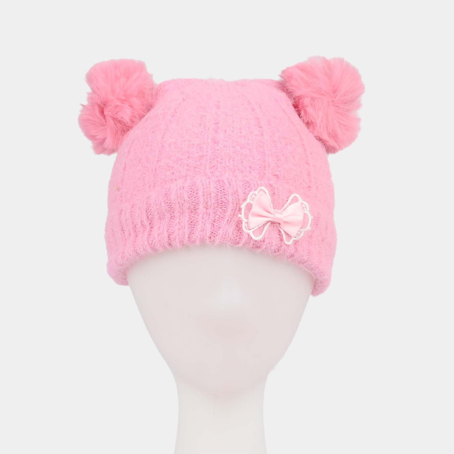 This cozy pink winter accessory features a bow and pom-poms on top, combining a cute and stylish design for a fun look.