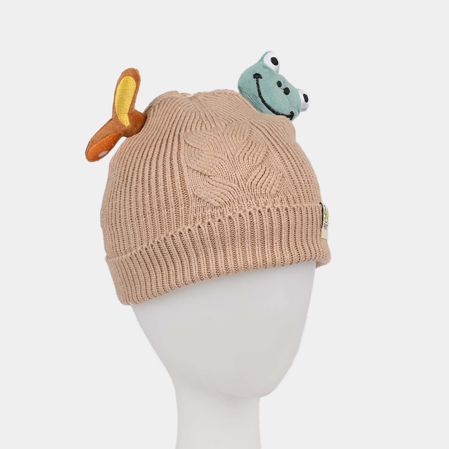 This cozy brown winter accessory features a frog-themed design on top, combining cuteness and style for a fun look.