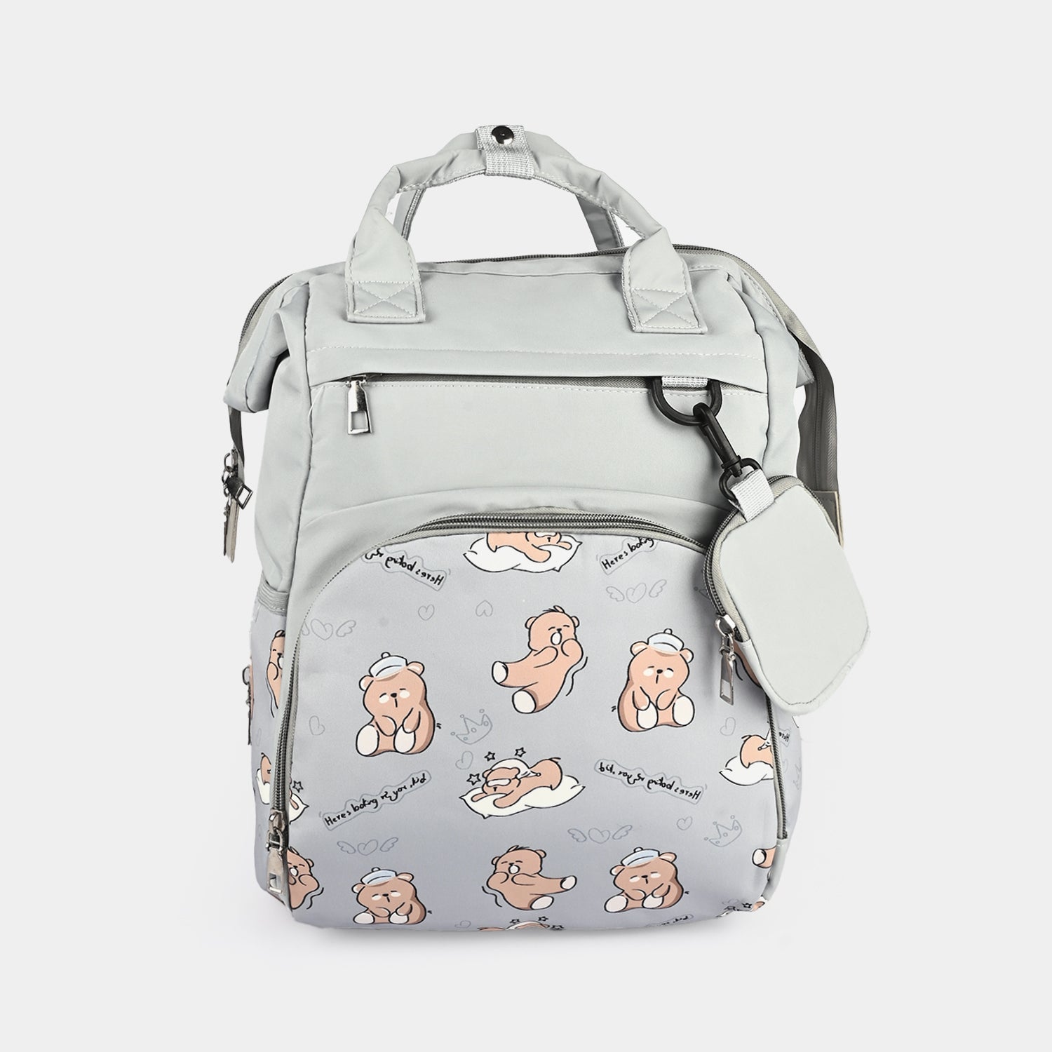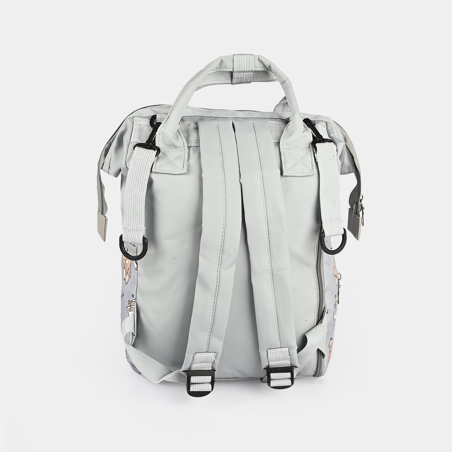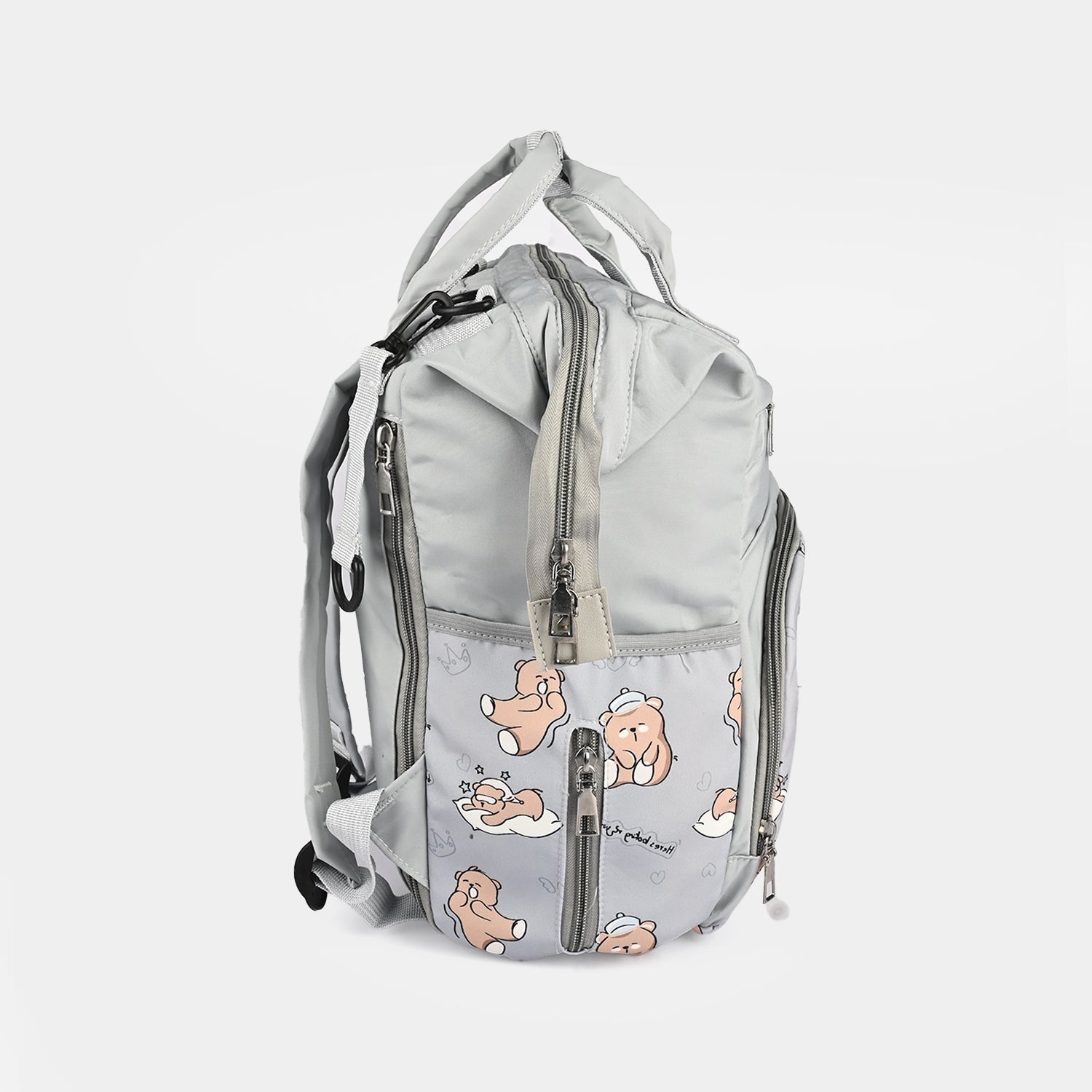 This grey diaper backpack features a large main compartment, multiple pockets, and secure zip closures. It can be carried by hand or worn as a backpack, making it comfortable and durable for daily use, travel, and outings.