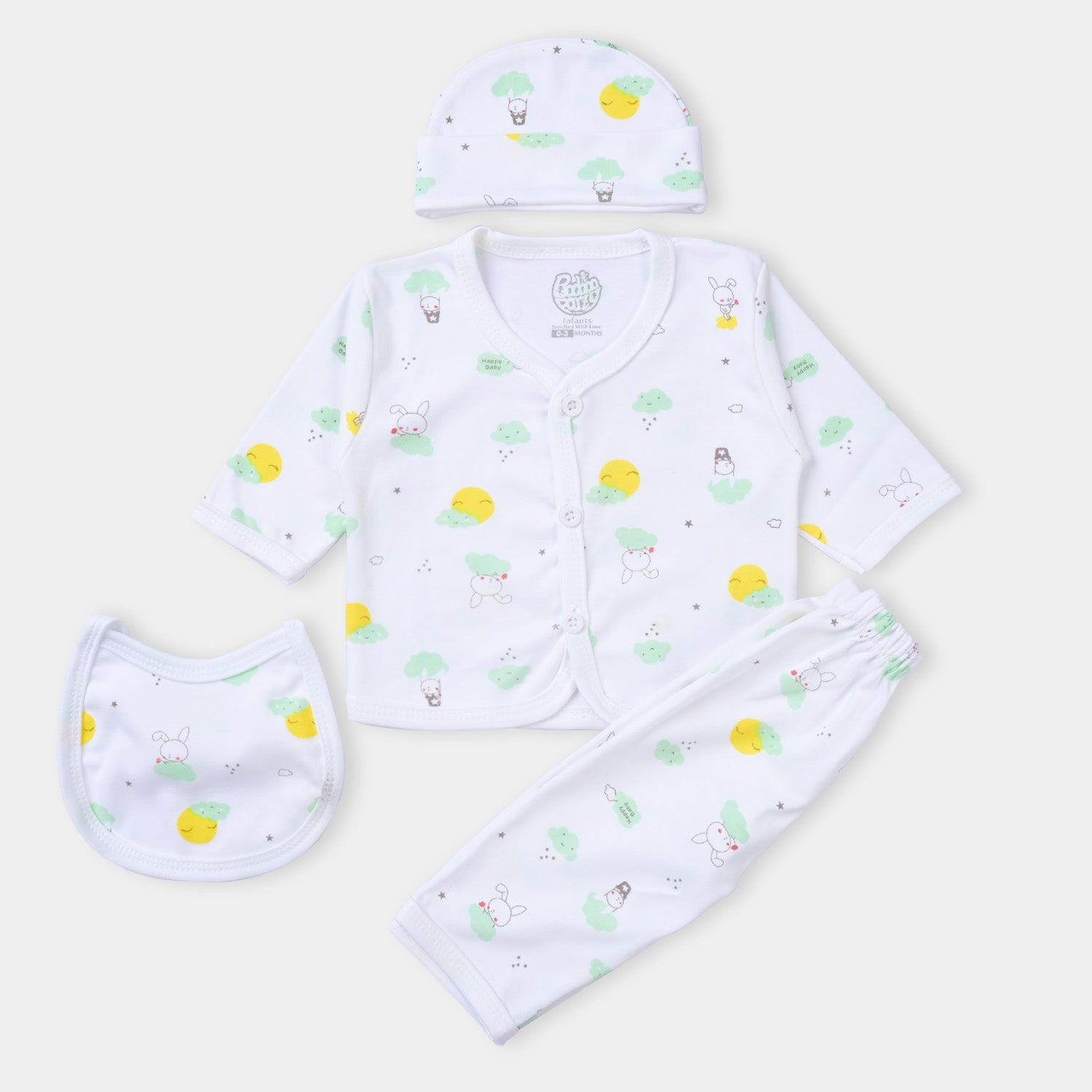 A soft and comfortable newborn outfit set designed to provide everyday ease for dressing, changing, and keeping your baby cozy. Includes top, pants, bib, and hat made for gentle wear.