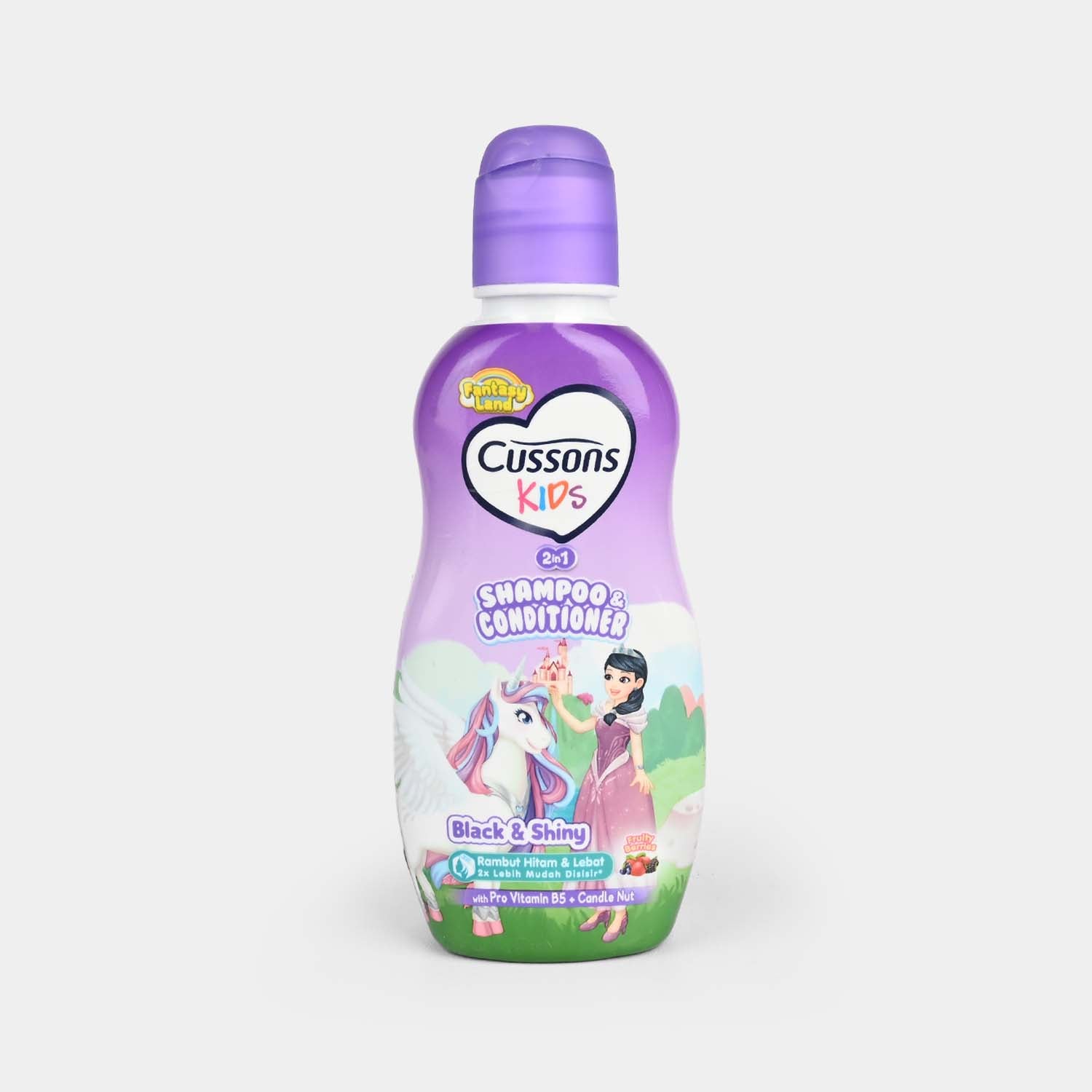 Cussons Kids 2 in 1 Shampoo Unicorn Black & Shiny is specially formulated with Triple Conditioner to moisturize hair, making it soft, dense, and 2x easier to comb. Enriched with hazelnut and Pro-Vitamin B5, this shampoo helps thicken hair while keeping its natural black shine.