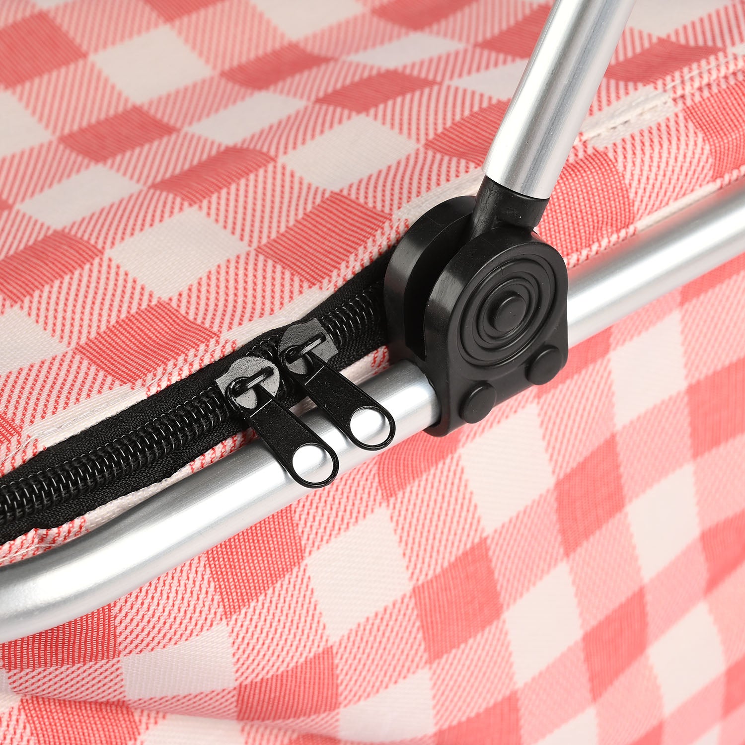 The basket features a spacious interior with a protective zip-top lid, helping keep items organized and shielded from dust. Its insulated lining maintains temperature, making it ideal for carrying food, drinks, and perishable items. When not in use, it folds flat, saving space and making storage simple.