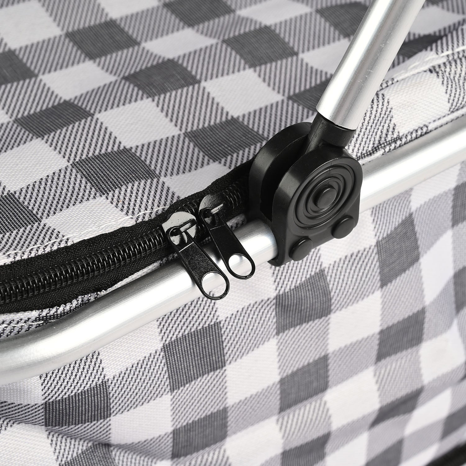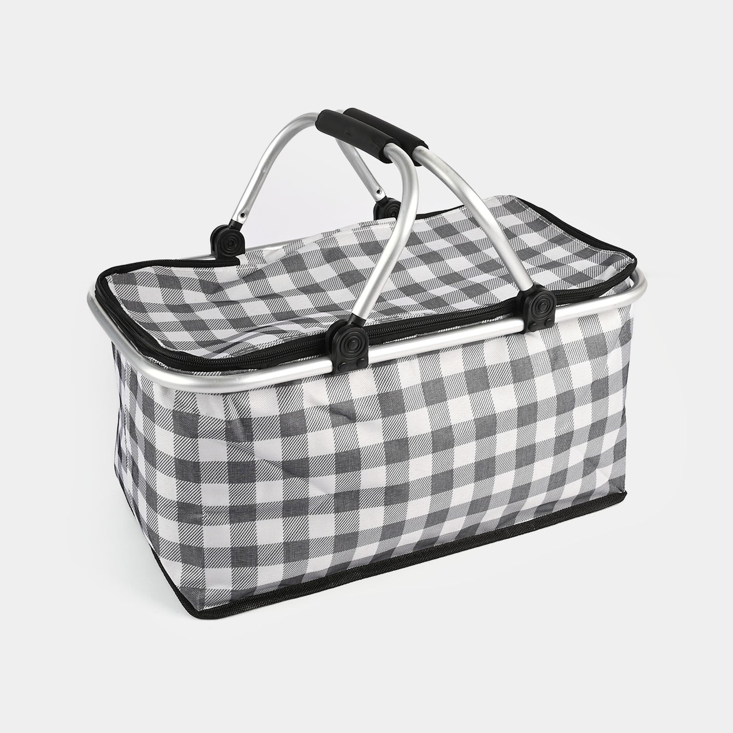 The basket features a spacious interior with a protective zip-top lid, helping keep items organized and shielded from dust. Its insulated lining maintains temperature, making it ideal for carrying food, drinks, and perishable items. When not in use, it folds flat, saving space and making storage simple.