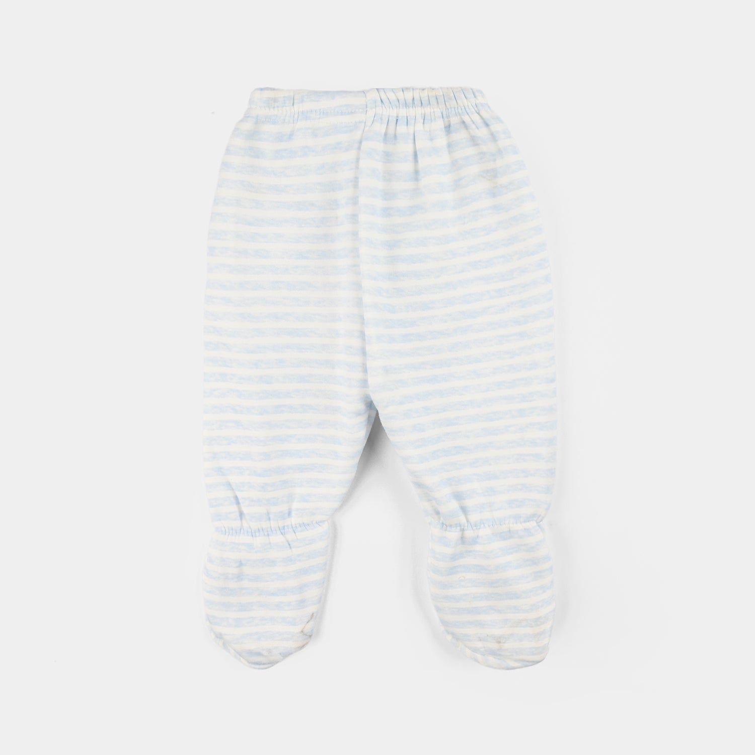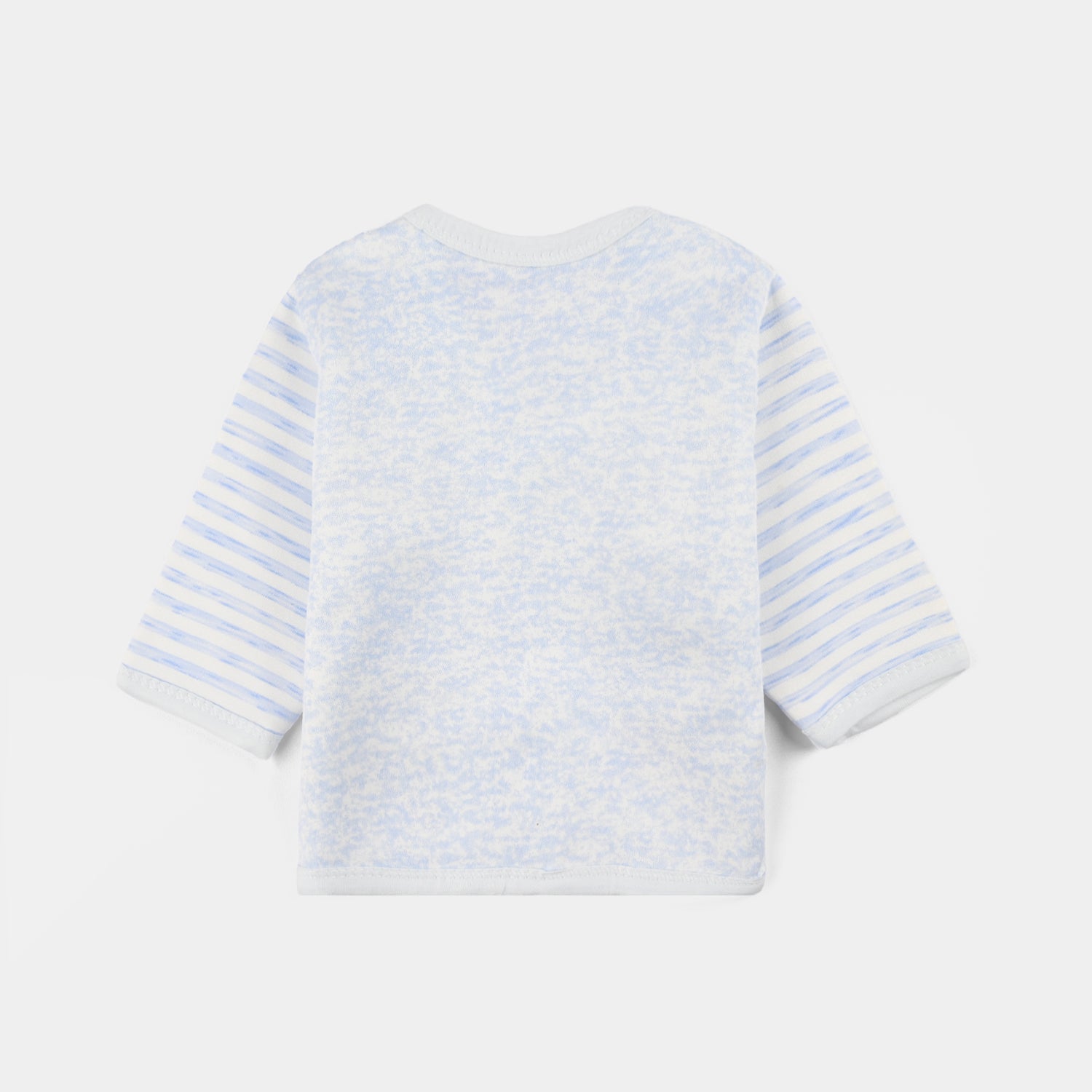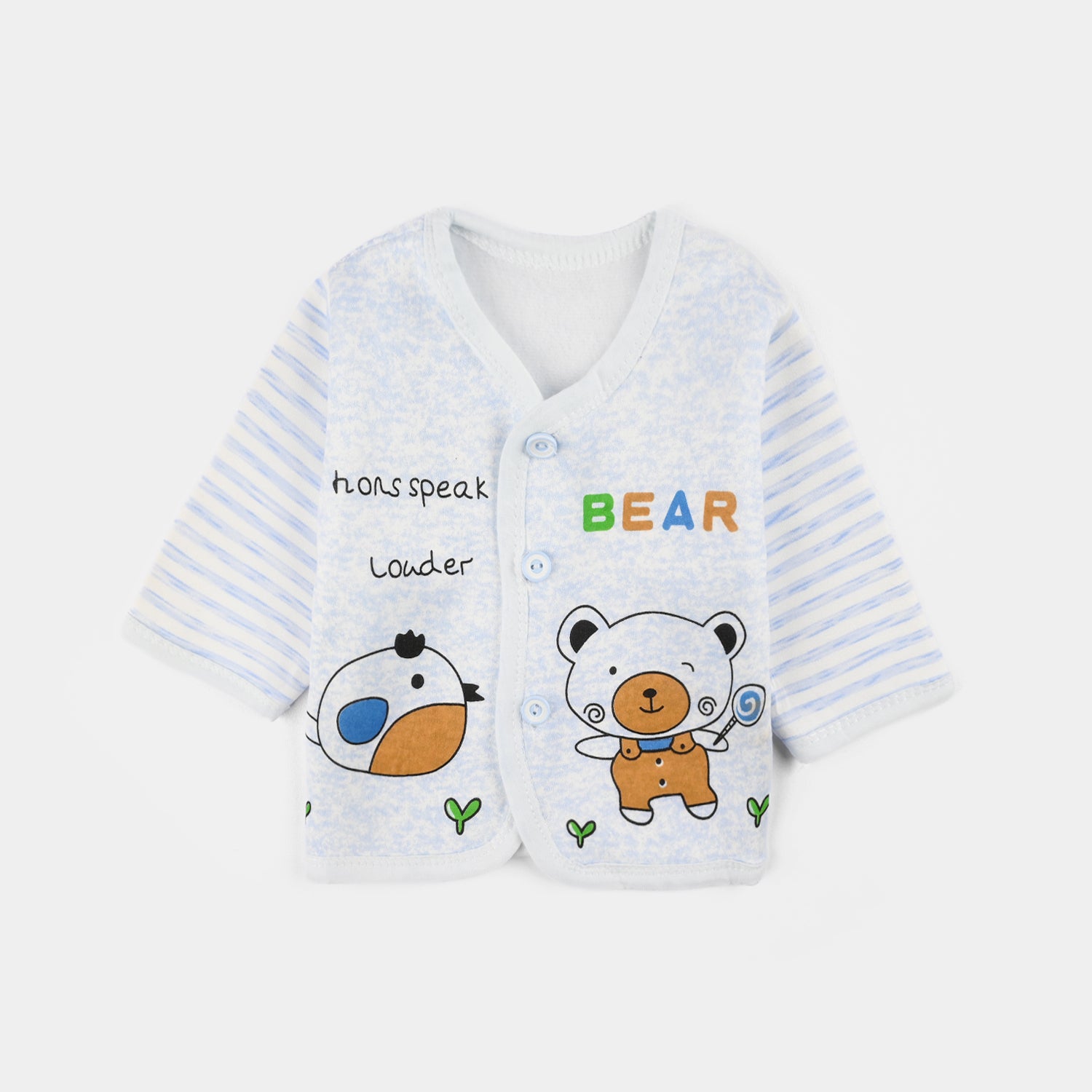 The infant unisex thermal innerwear set in white includes a round-neck printed top with front buttons and full sleeves, plus matching trousers with attached socks, offering cozy and comfortable warmth for babies.