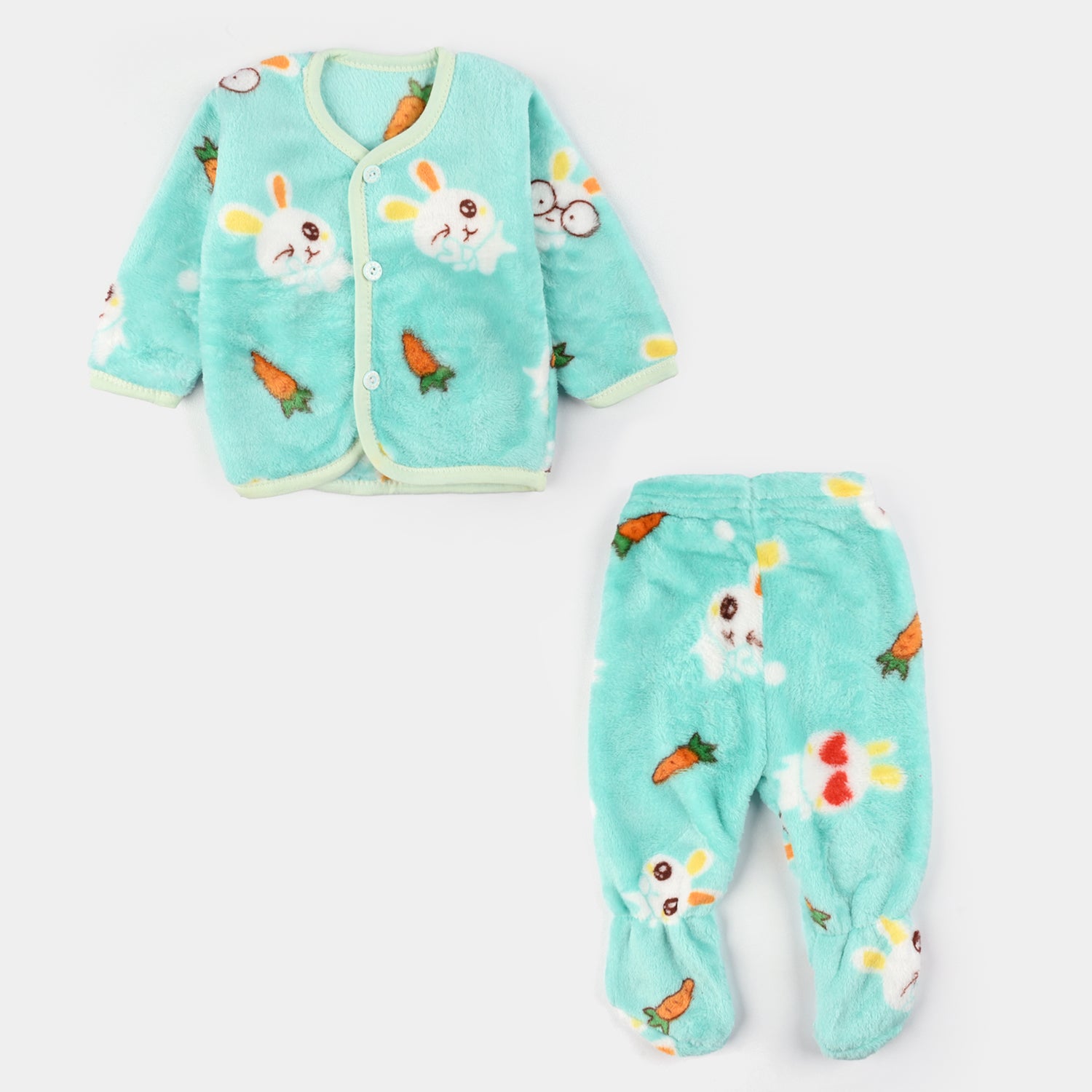 The infant unisex thermal innerwear set in green includes a round-neck printed top with front buttons and full sleeves, plus matching trousers with attached socks, offering cozy and comfortable warmth for babies.