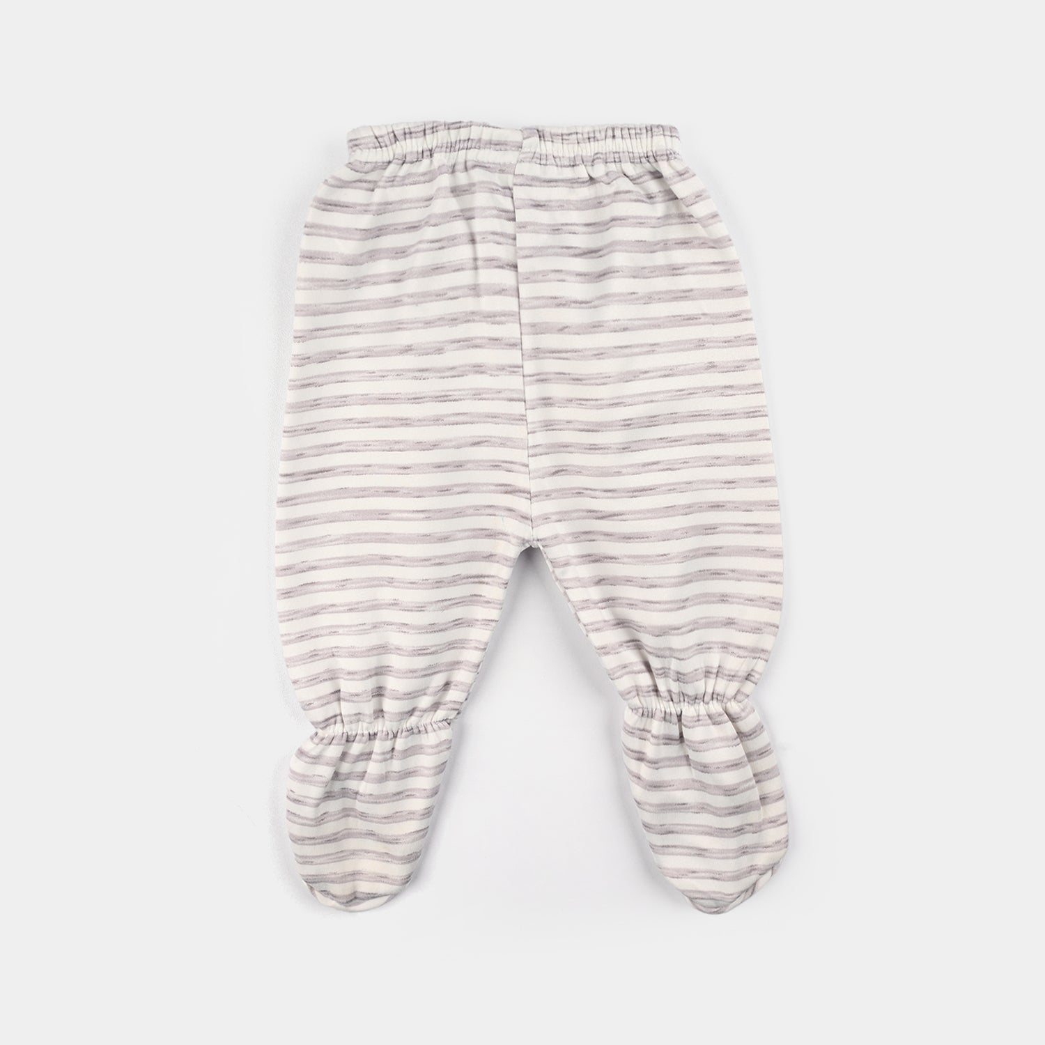 The infant unisex thermal innerwear set in grey includes a round-neck printed top with front buttons and full sleeves, plus matching trousers with attached socks, offering cozy and comfortable warmth for babies.
