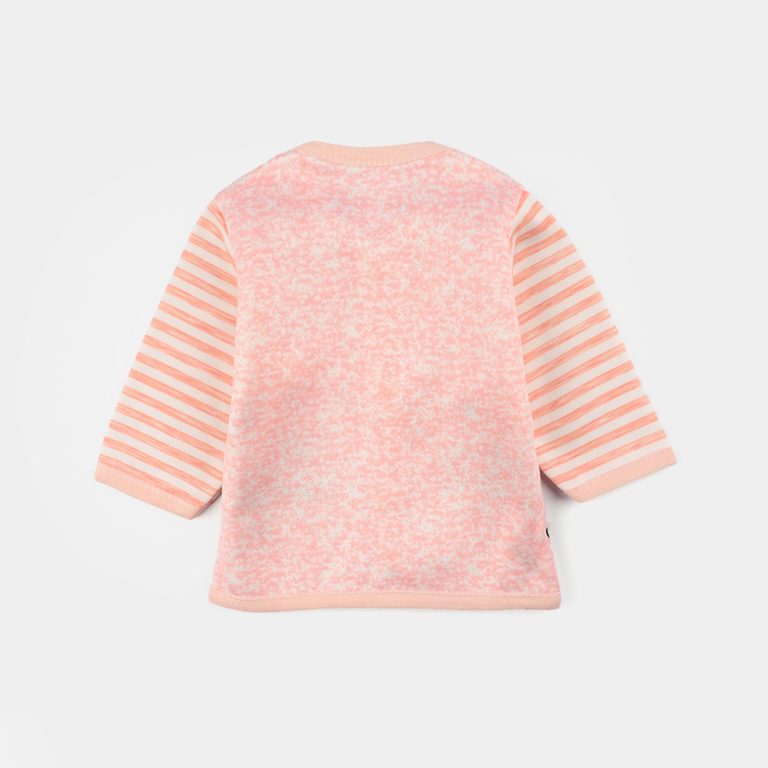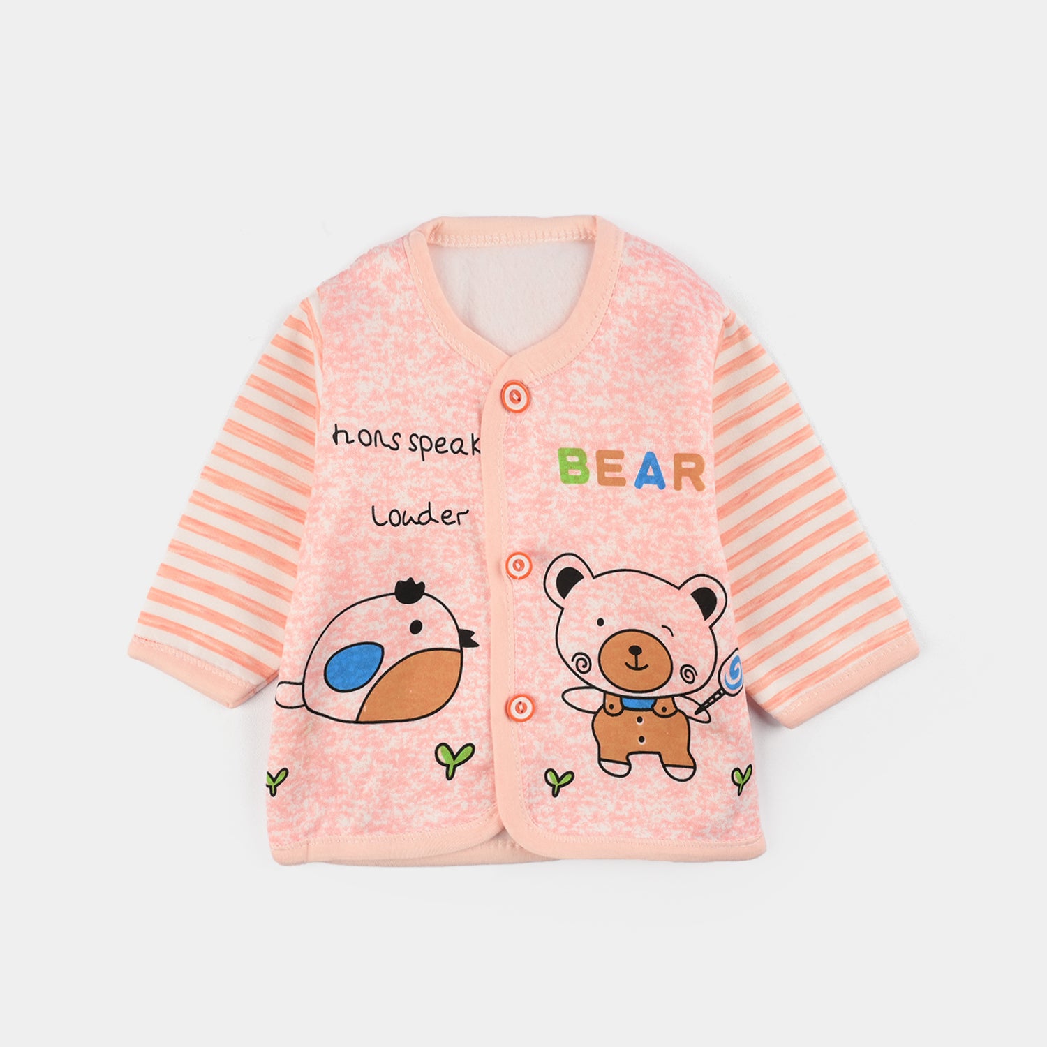 The infant unisex thermal innerwear set in peach includes a round-neck printed top with front buttons and full sleeves, plus matching trousers with attached socks, offering cozy and comfortable warmth for babies.