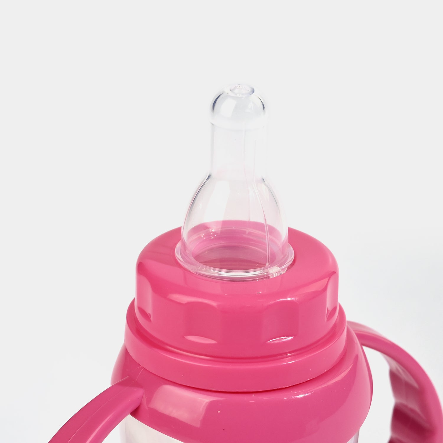 Pink baby bottle with handles, featuring a printed bird graphic and an anti-colic system to reduce swallowed air and protect your baby’s tummy. BPA-free for safe feeding.