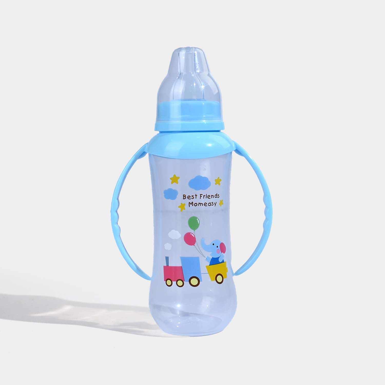 Blue baby bottle with handles, featuring a printed playful graphic and an anti-colic system to reduce swallowed air and protect your baby’s tummy. BPA-free for safe feeding.