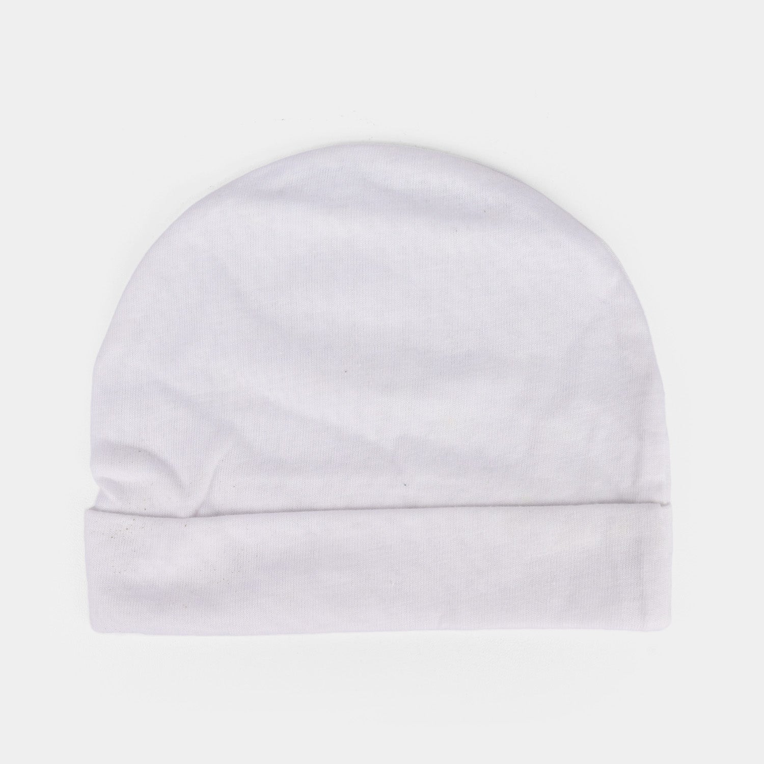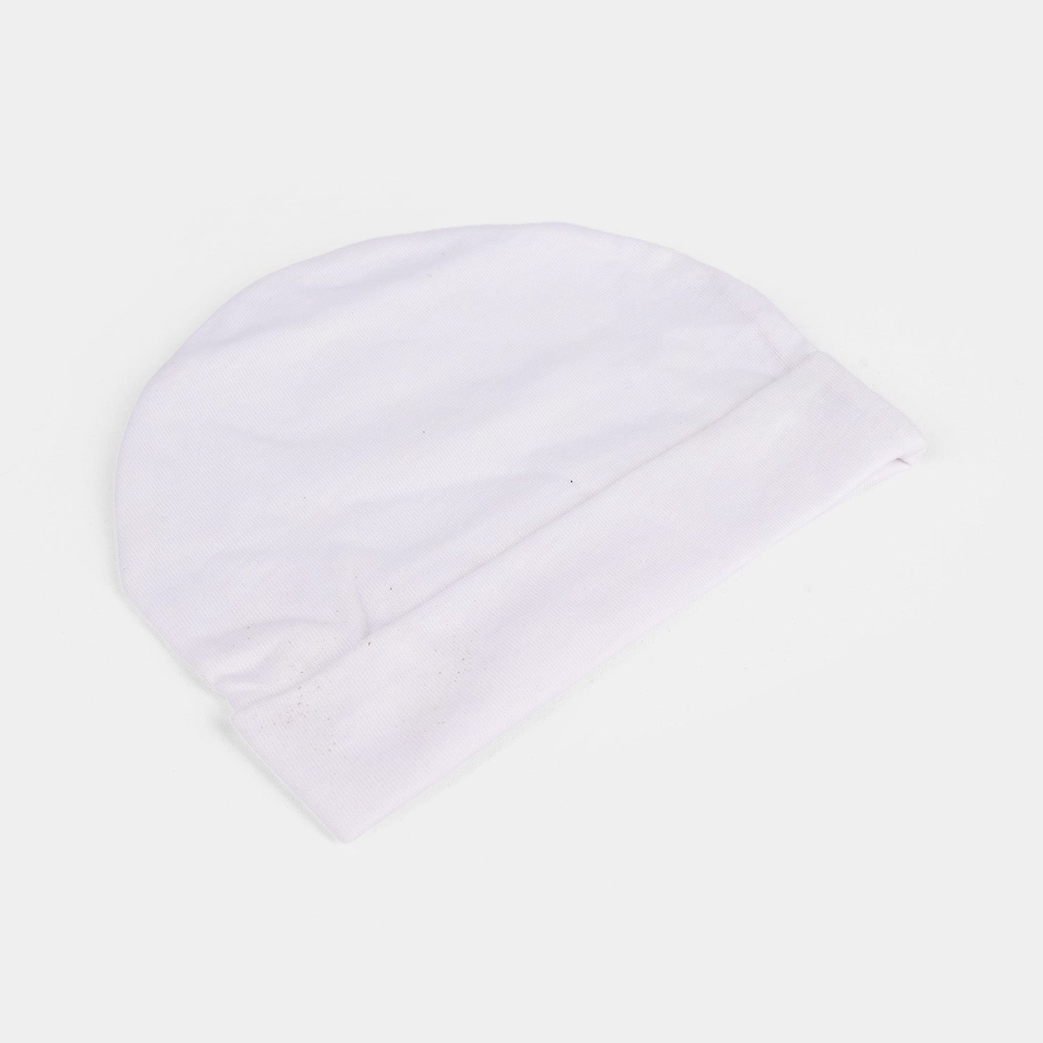 Infant cotton cap in white, made from soft, stretchy cotton for a snug fit, keeping your baby comfortable and warm all day.