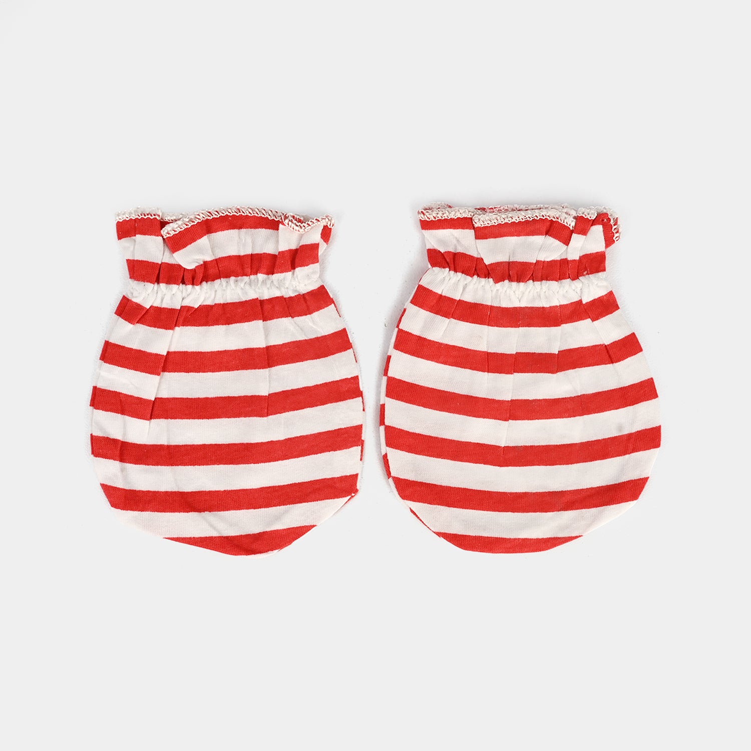 Baby mittens in white and red with stripes, featuring elasticized cuffs for a secure, slip-free fit.