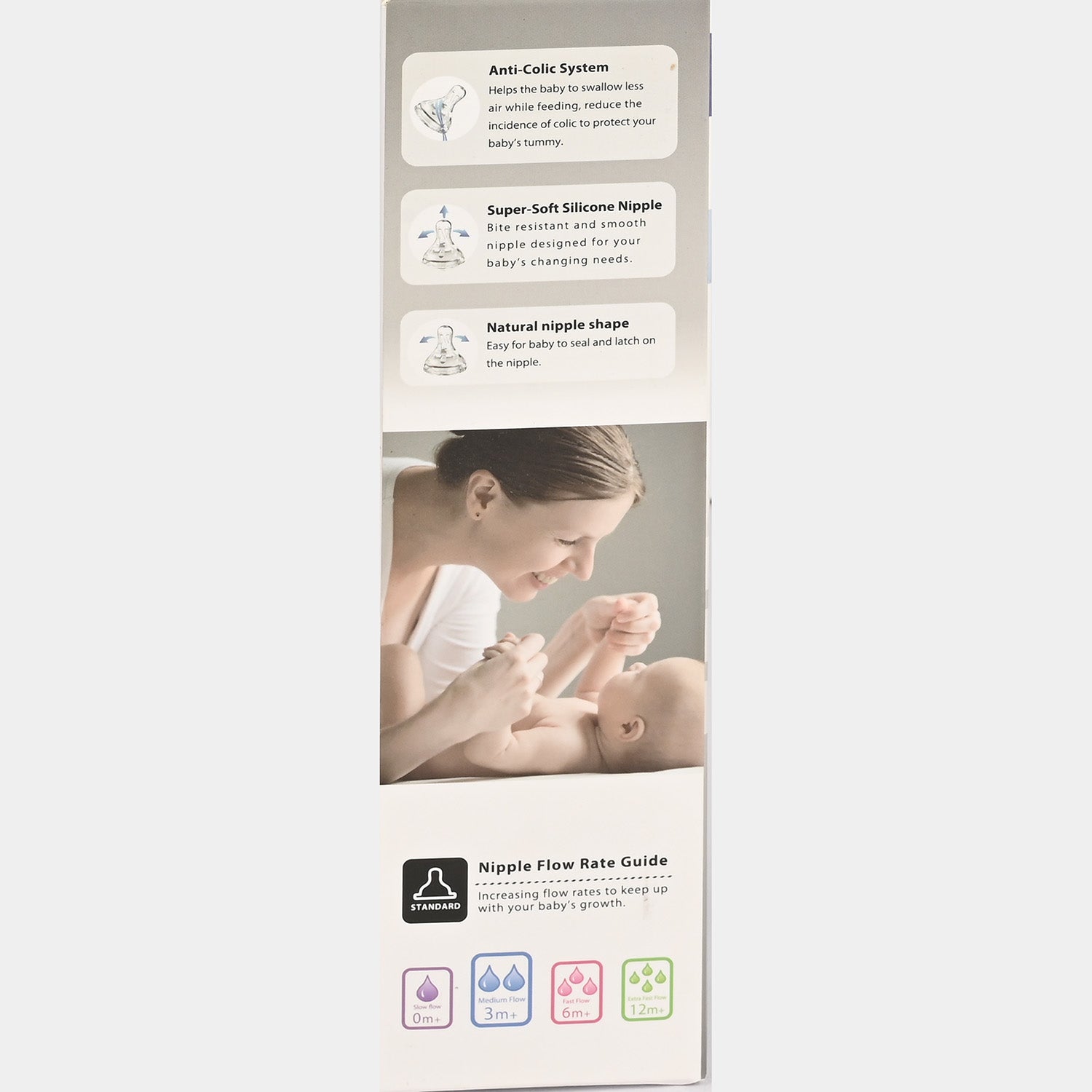 The feeding experience has gotten better with this wide-neck feeder. The anti-colic system reduces discomfort, while the natural nipple shape and super soft silicone material make latching comfortable.