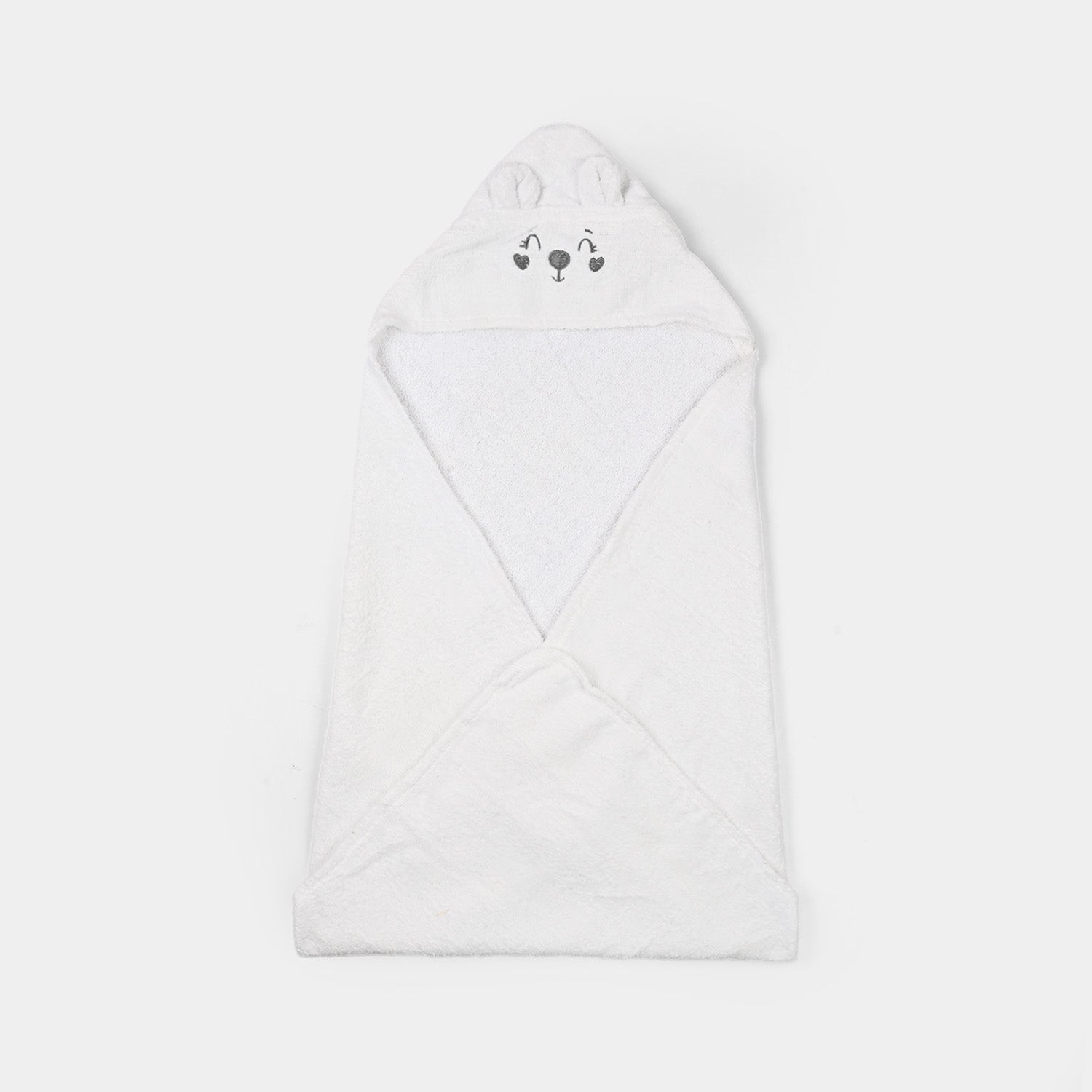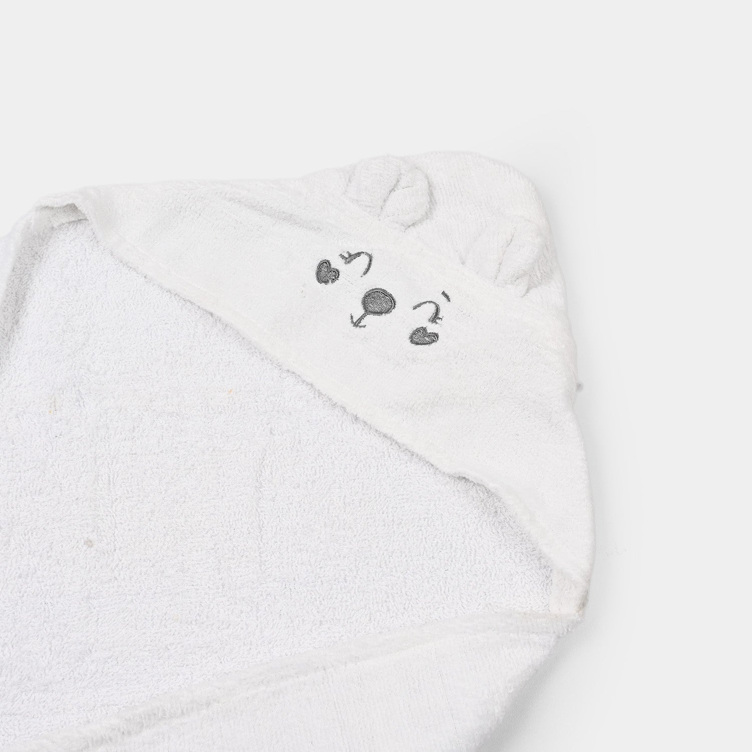 Baby hooded bath towel in white featuring a hood, soft and absorbent for gentle drying after bath time.