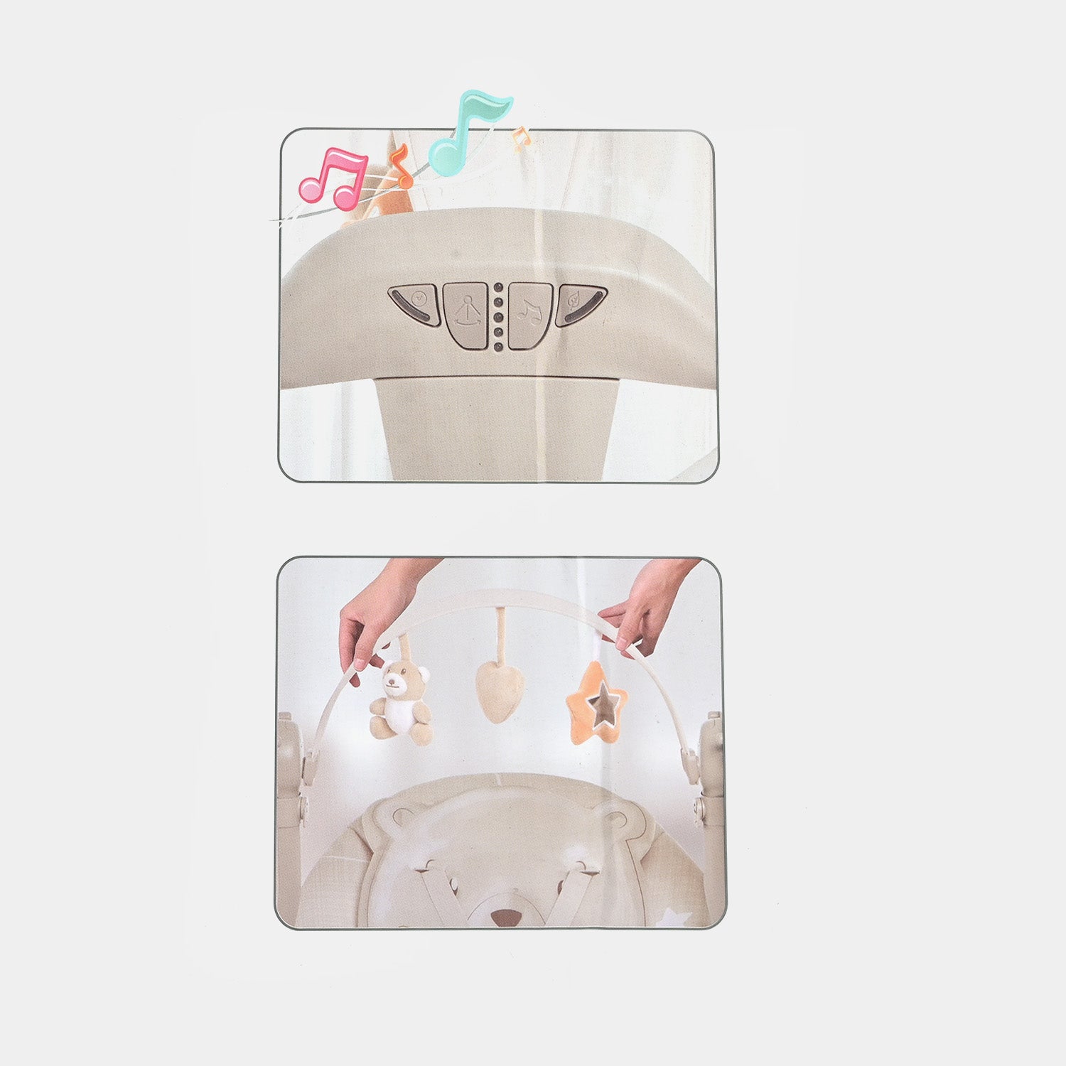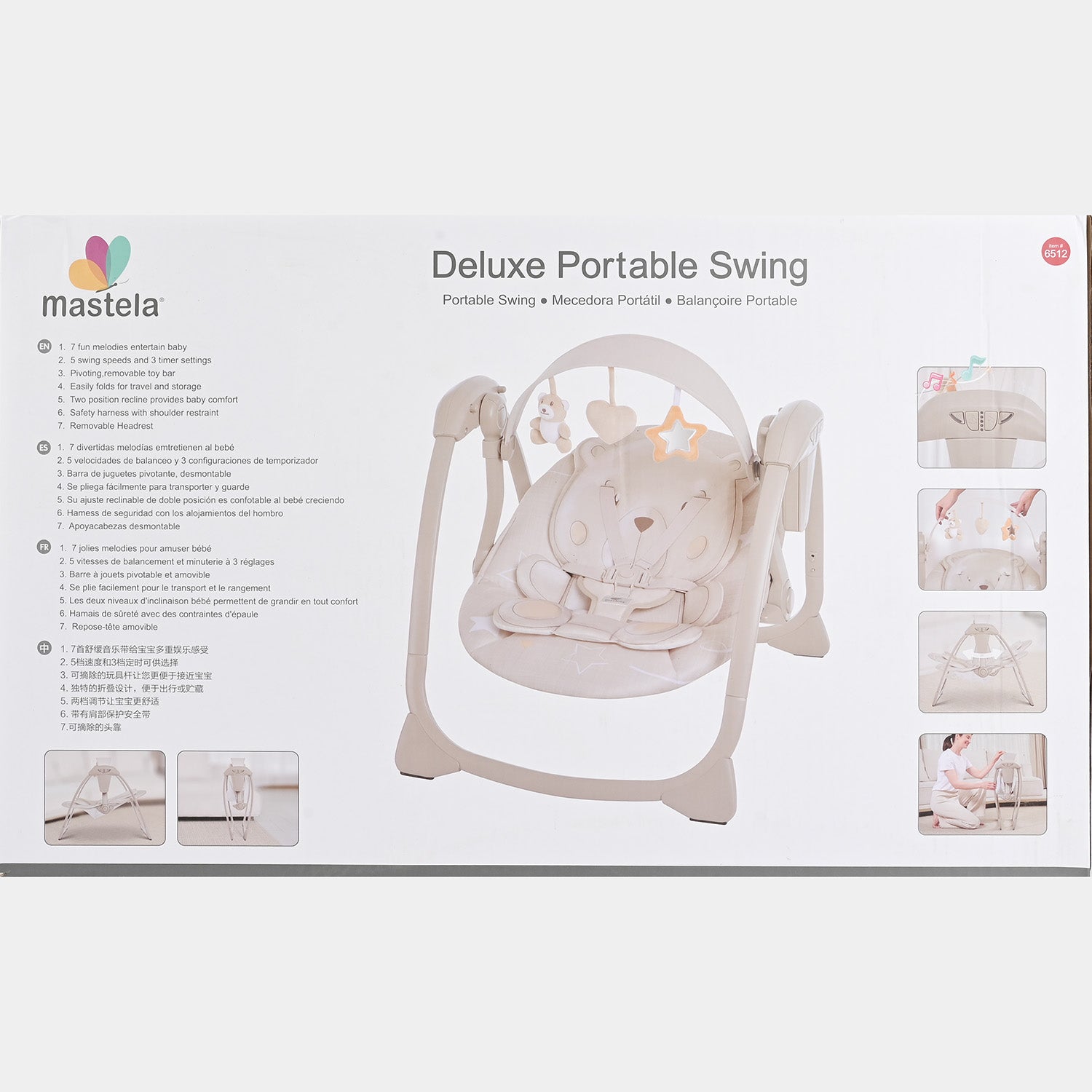 Mastela presents a comfortable swing for your little one. The 2 position Recline seat with 3 point safety harness with shoulder restraint ensures comfort. Swing features 5 swing speed. Swing has a Plaything bar with 2 fun Playthings. Fun melodies keep the baby entertained.