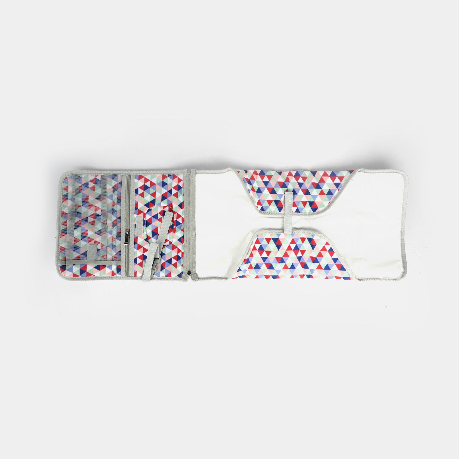 This foldable organizer neatly stores toiletries, baby items, cosmetics, and accessories while traveling. Its multiple compartments and bright geometric design offer both practicality and style.