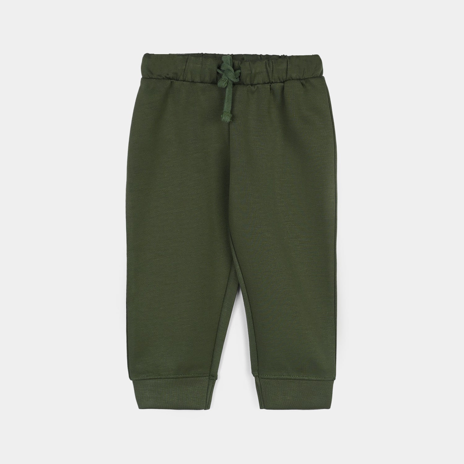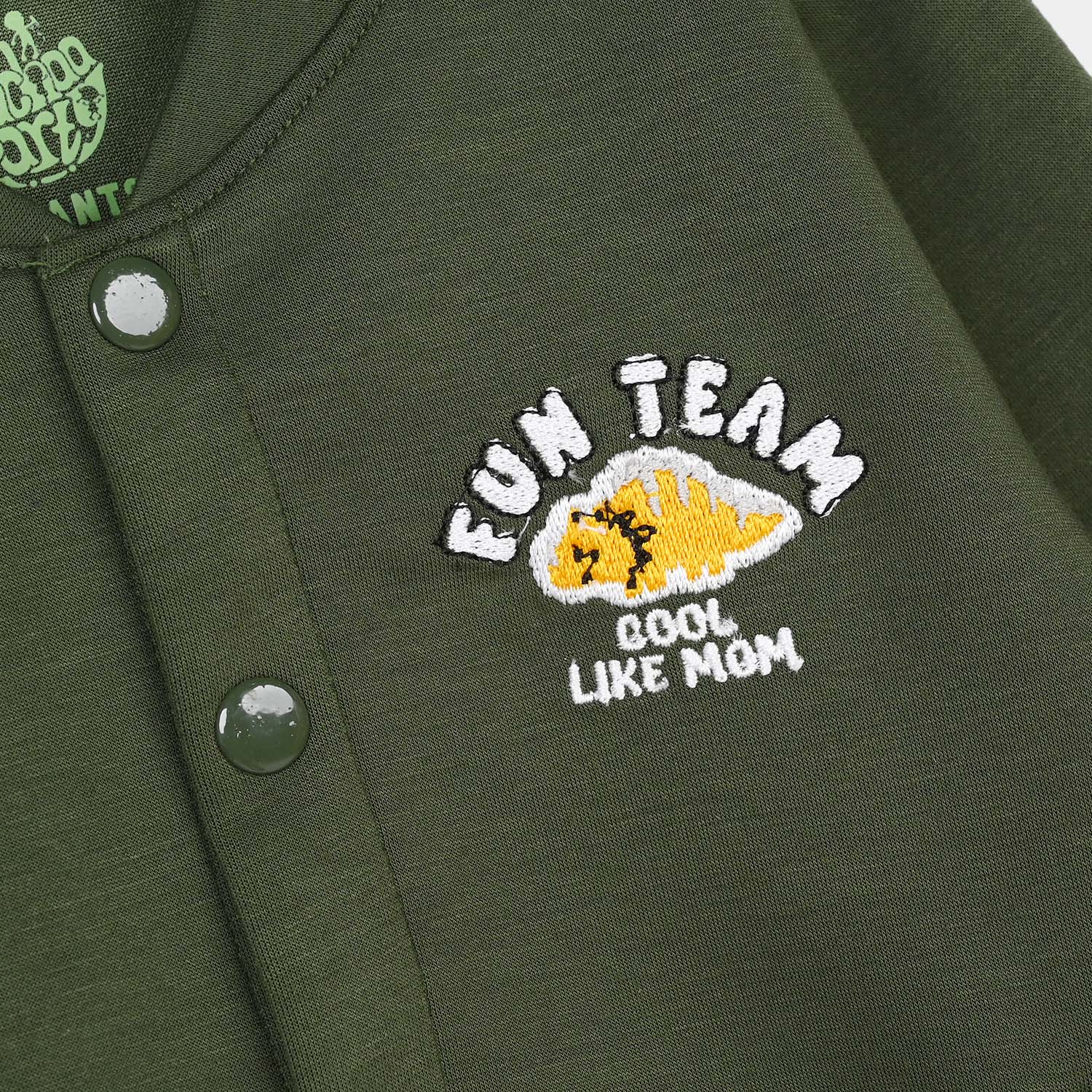 Boys olive green coord set in cotton interlock featuring an open-style jacket with full sleeves, pockets, and a "Fun Team" embroidery on the front, paired with matching bottoms.