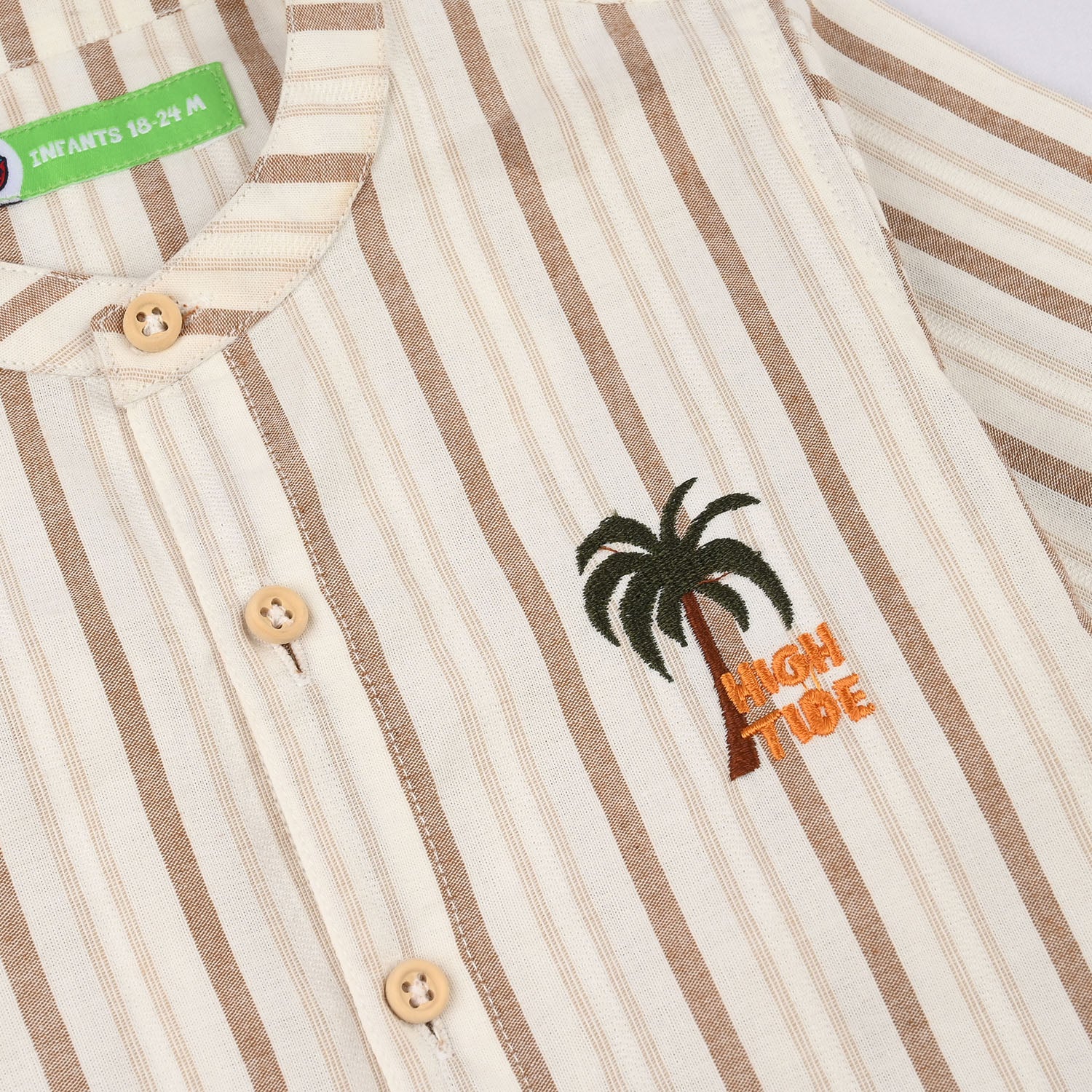 Infant boys' cotton woven suit in brown stripe features a short-collared, front-open shirt with half sleeves and matching shorts, perfect for a smart and comfortable everyday look.
