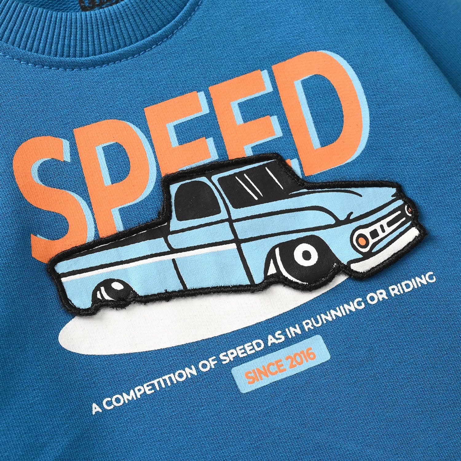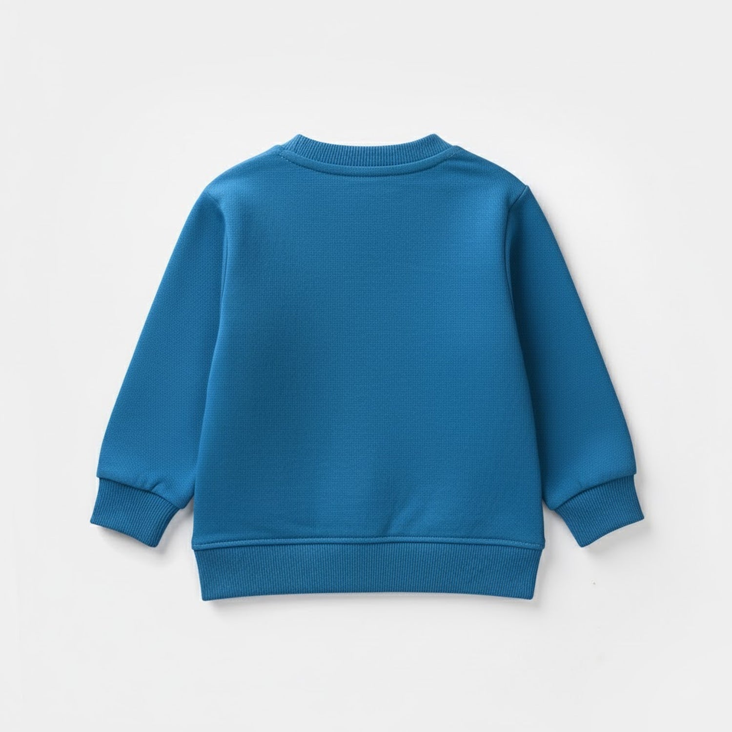 This blue sweatshirt features a round neck, long sleeves, and a printed front text for a stylish and cozy look.
