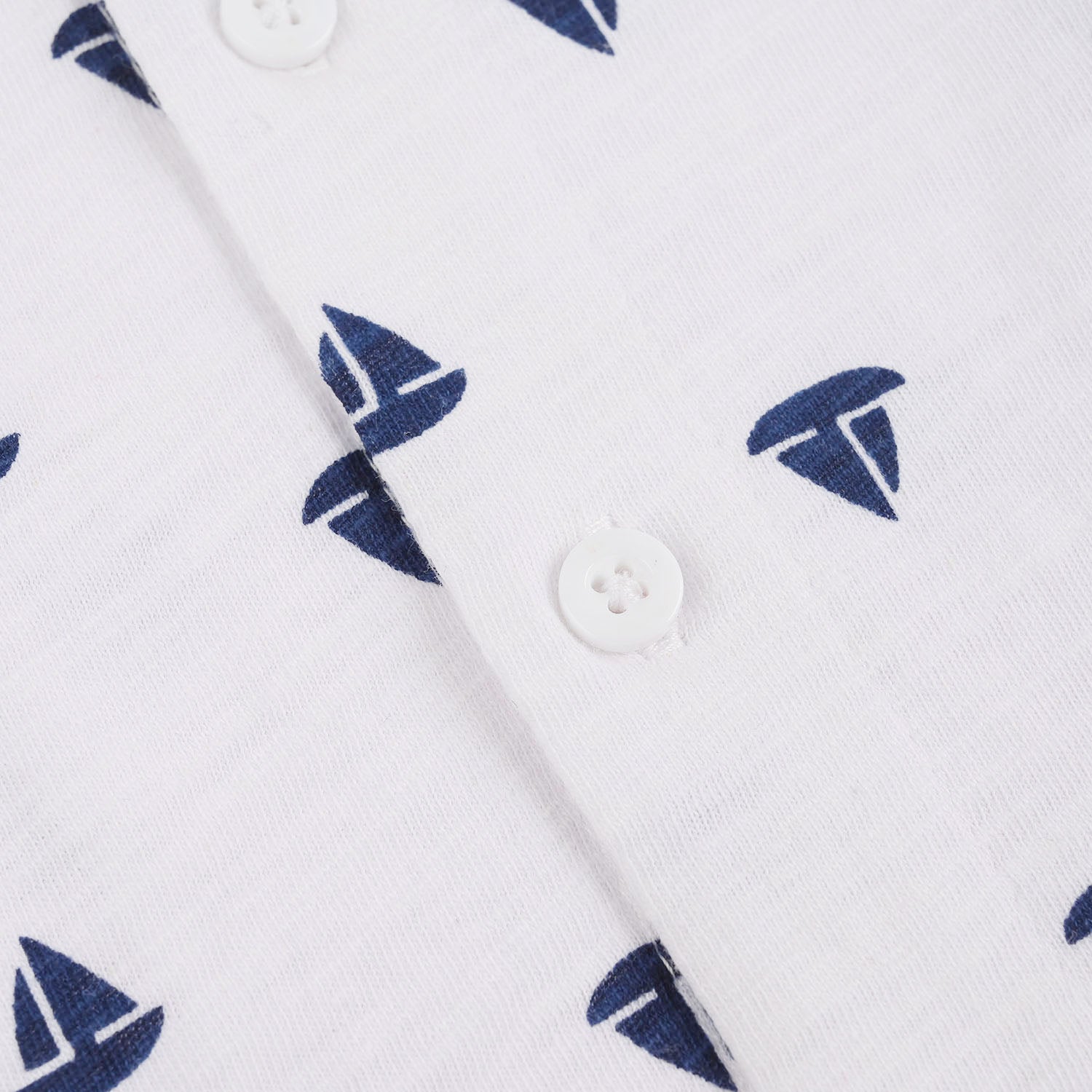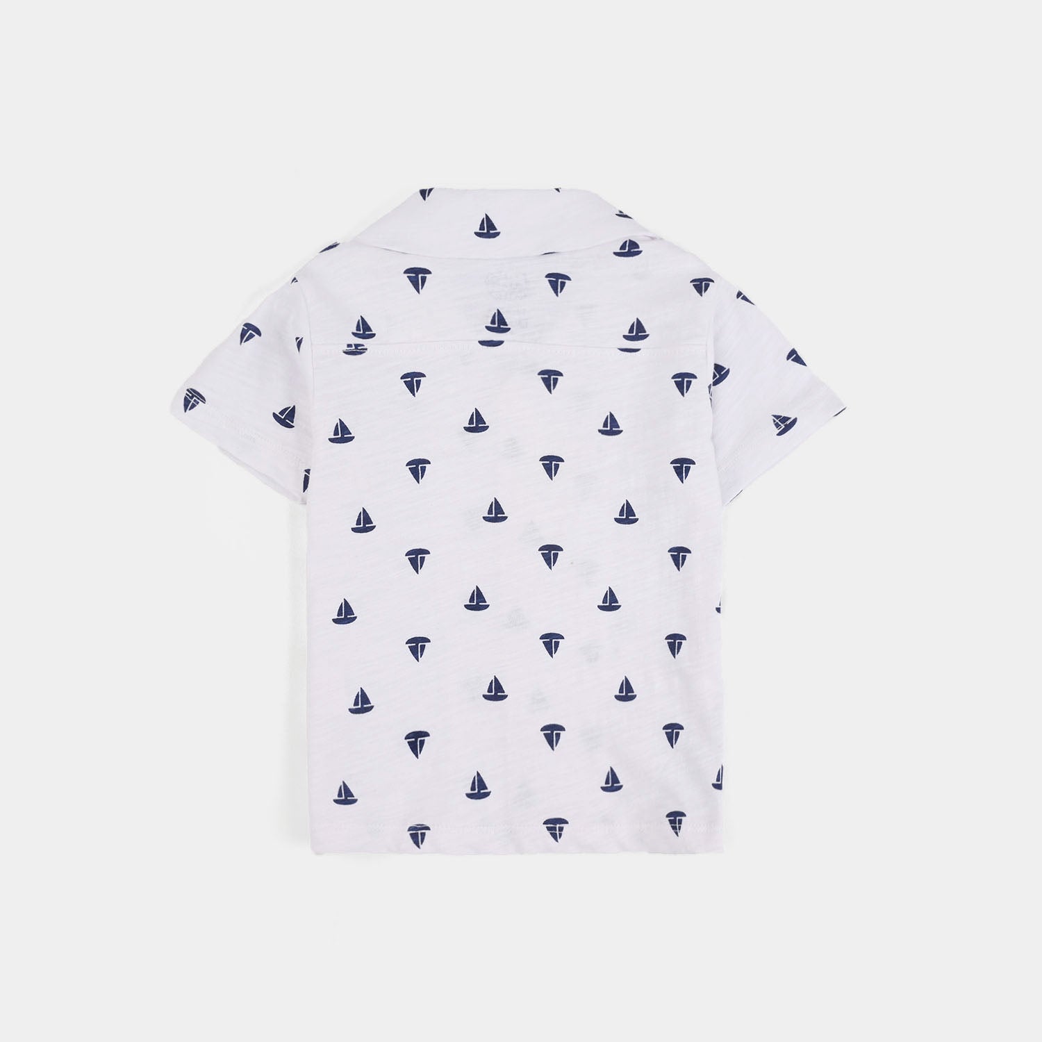 This navy slub jersey knitted shirt for infant boys features a collared neckline, front open style, half sleeves, and a soft textured fabric, perfect for a comfortable and casual everyday look.