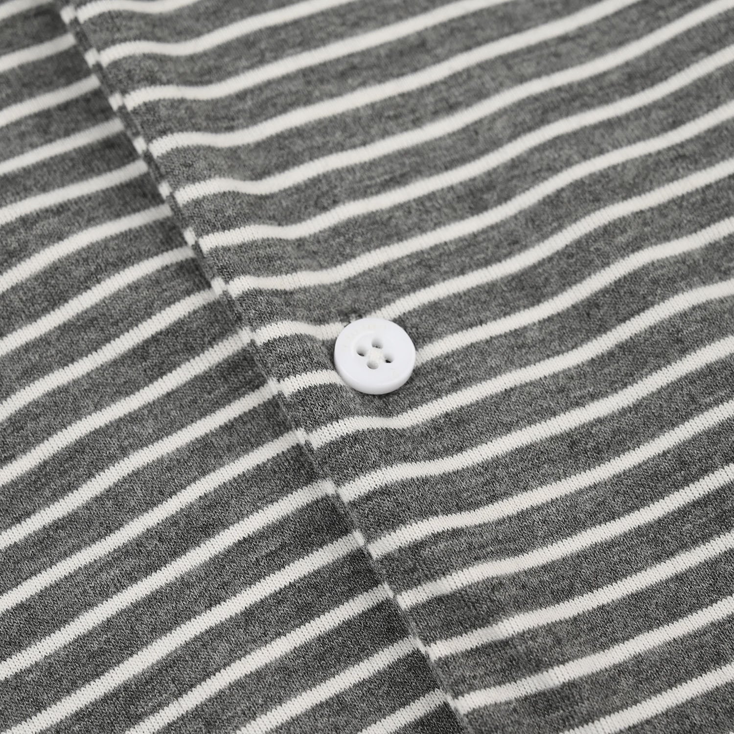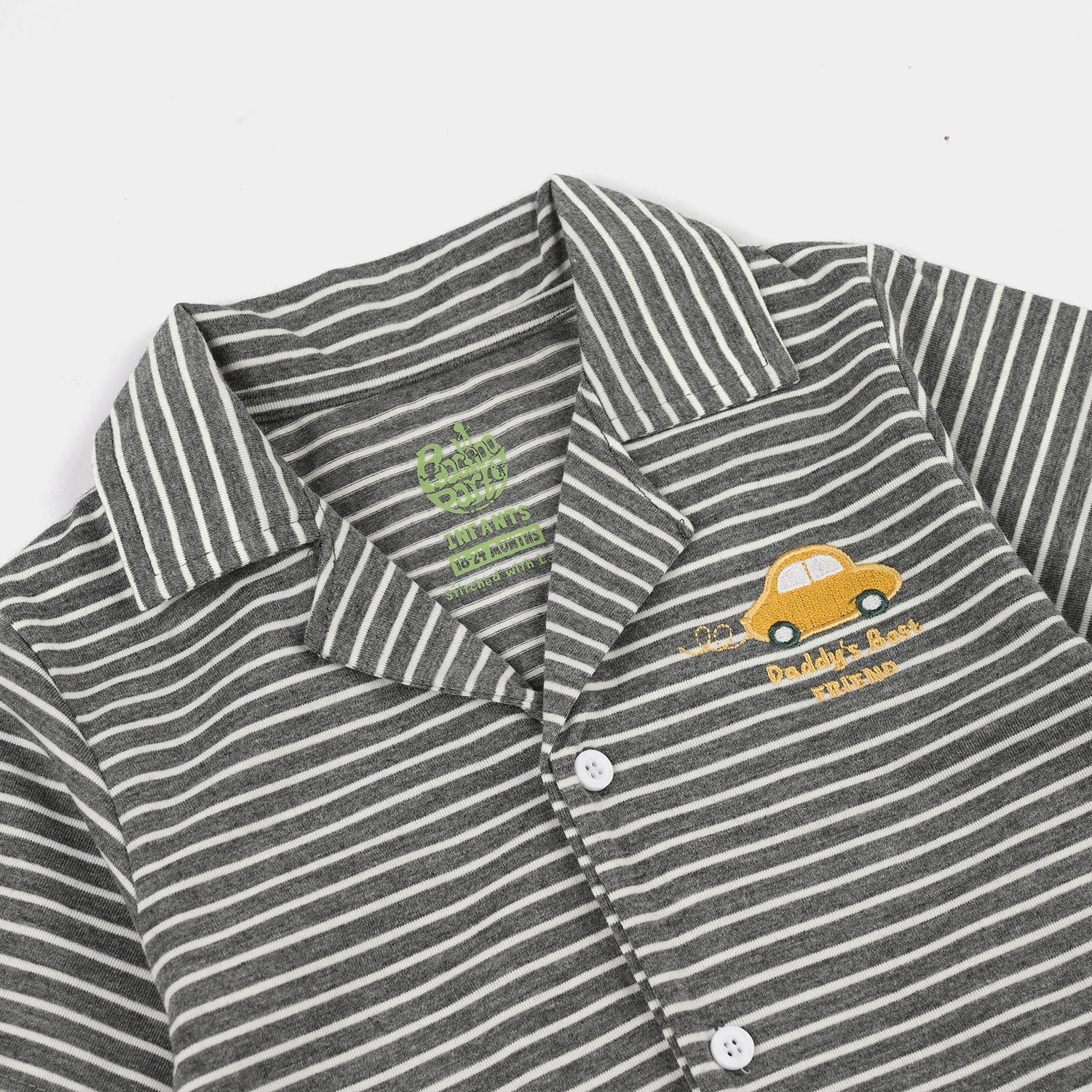 This black and white striped yarn-dyed knitted romper for infant boys features a collar, front button opening, half sleeves, half-length design, and a car embroidery on the front, perfect for a smart and comfortable everyday look.
