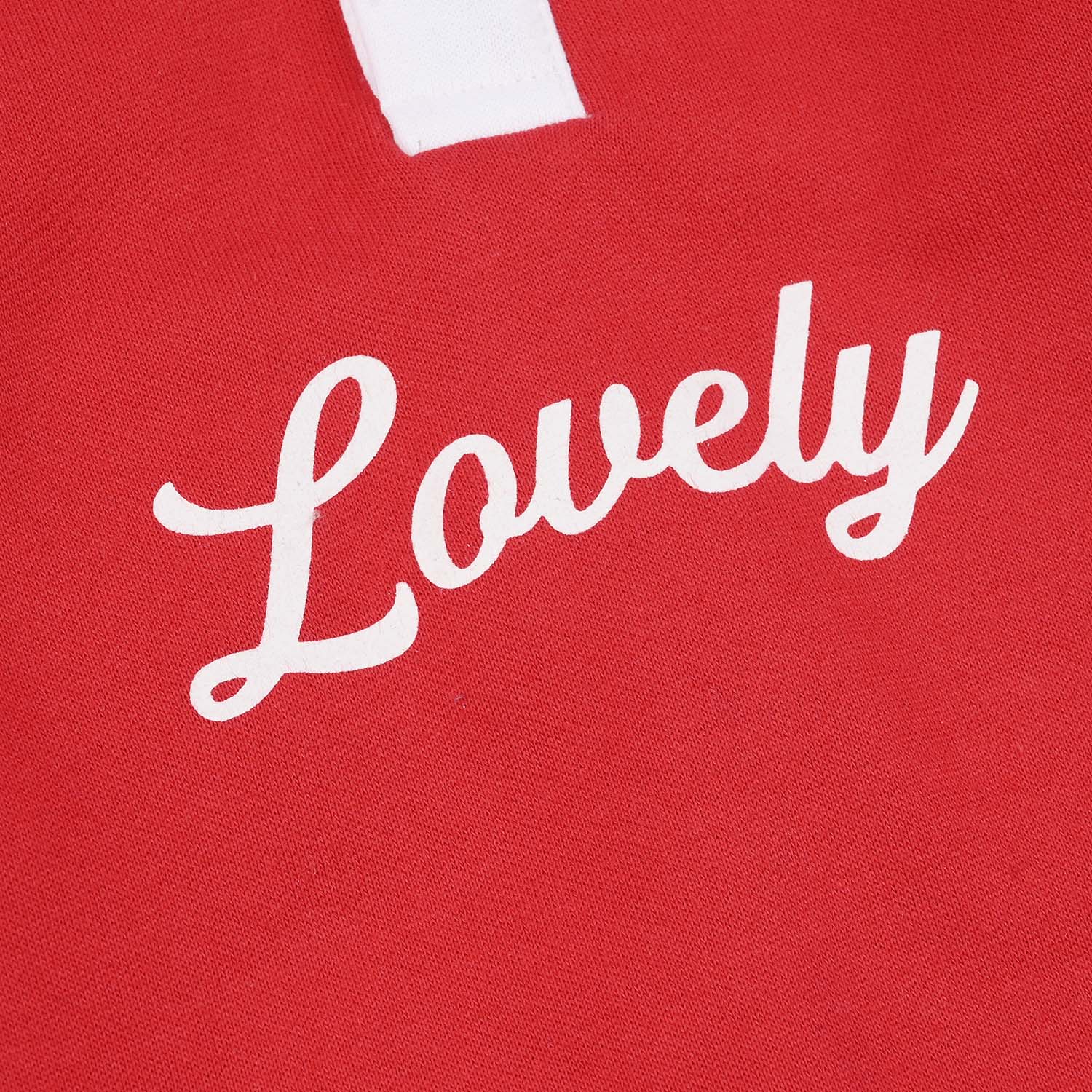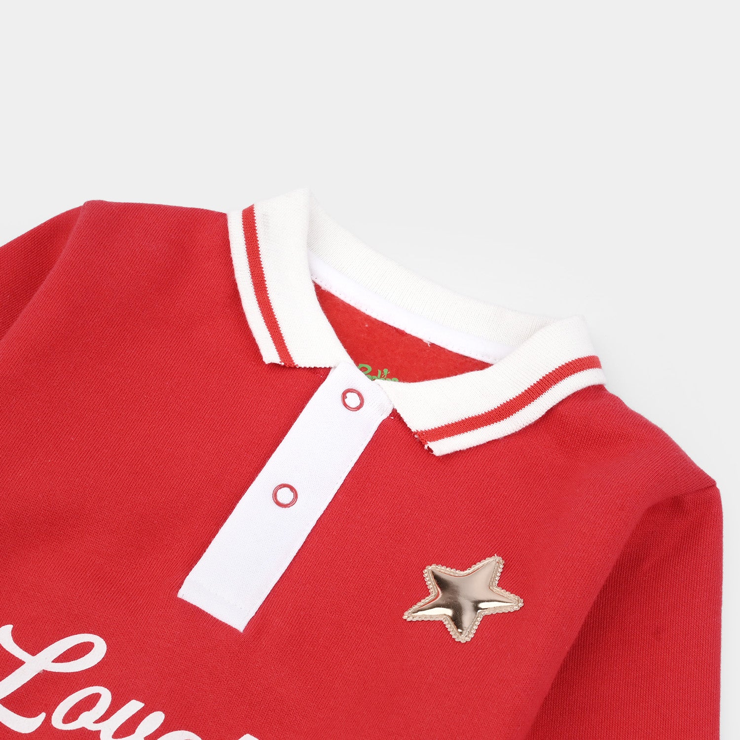 Baby red romper with white contrast and a collar, featuring a printed front and star embellishments, perfect for all-day comfort.