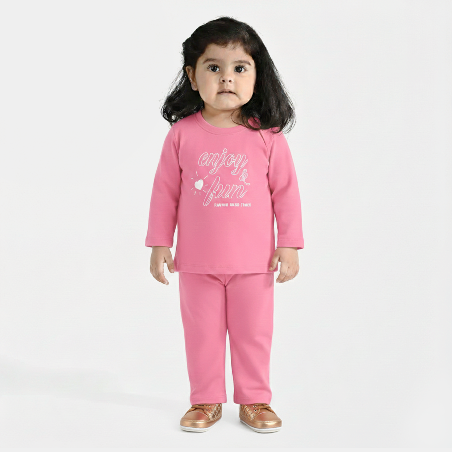 Basic pink cotton interlock set featuring a round neck, full sleeves, and an “Enjoy and Fun” print on the front, paired with matching bottoms.