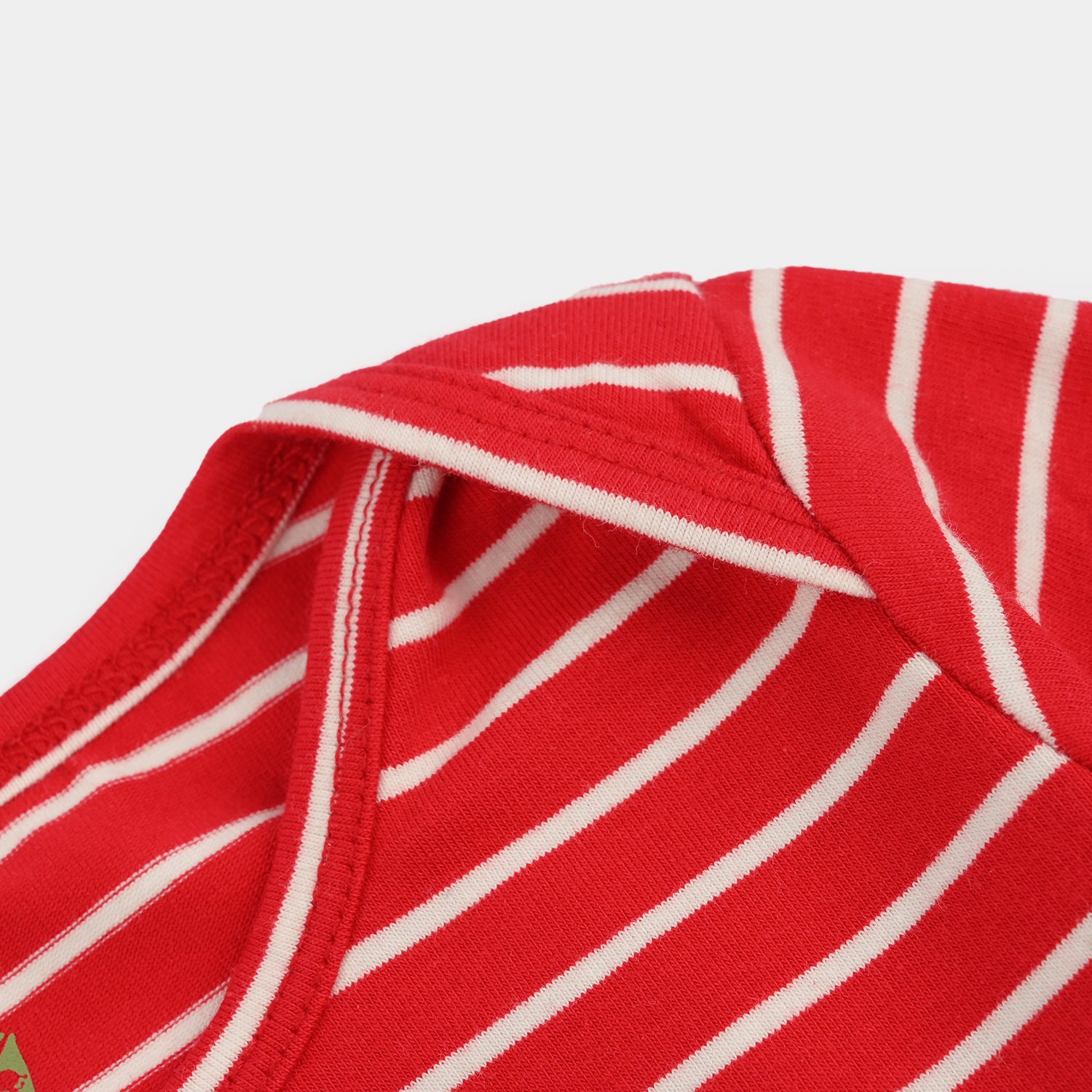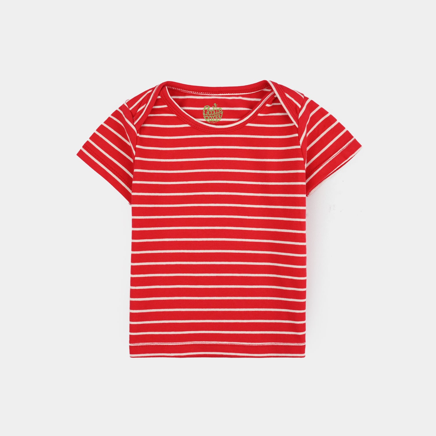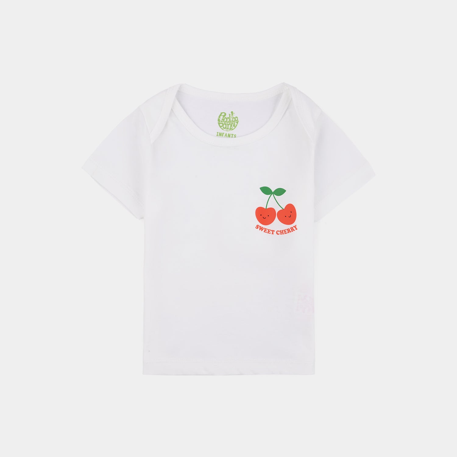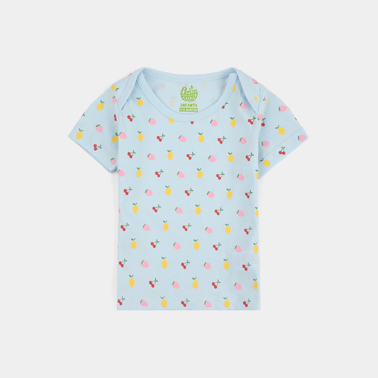 Infant girls’ cotton jersey T-shirt set in blue, red, and white, featuring round necks and fun fruit and stripes prints, perfect for a comfortable and playful everyday look.
