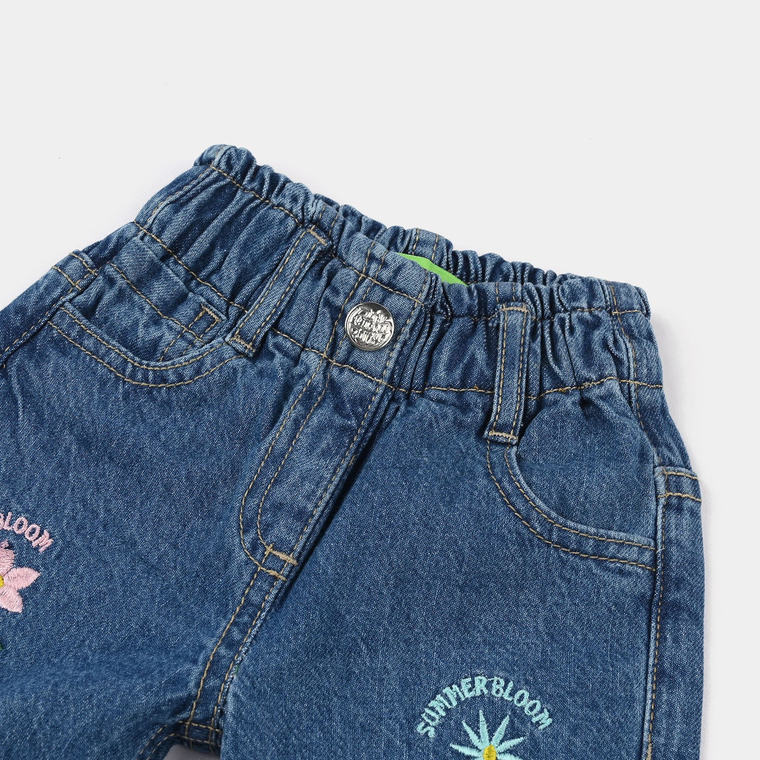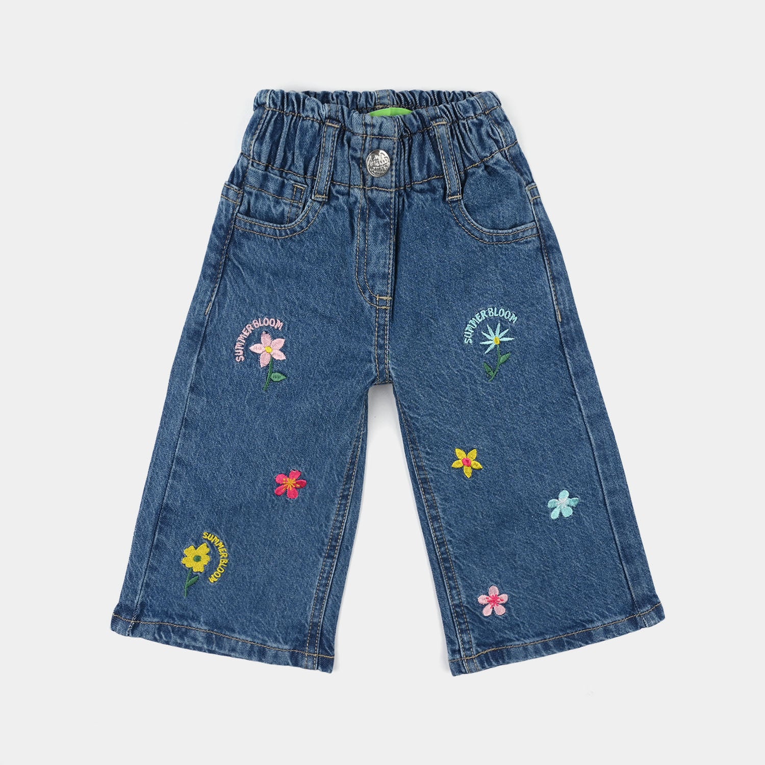 These mid-blue denim stretch pants for infant girls feature pockets, all-over floral embroidery, and a loose wide-leg fit, perfect for a stylish and comfortable everyday look.