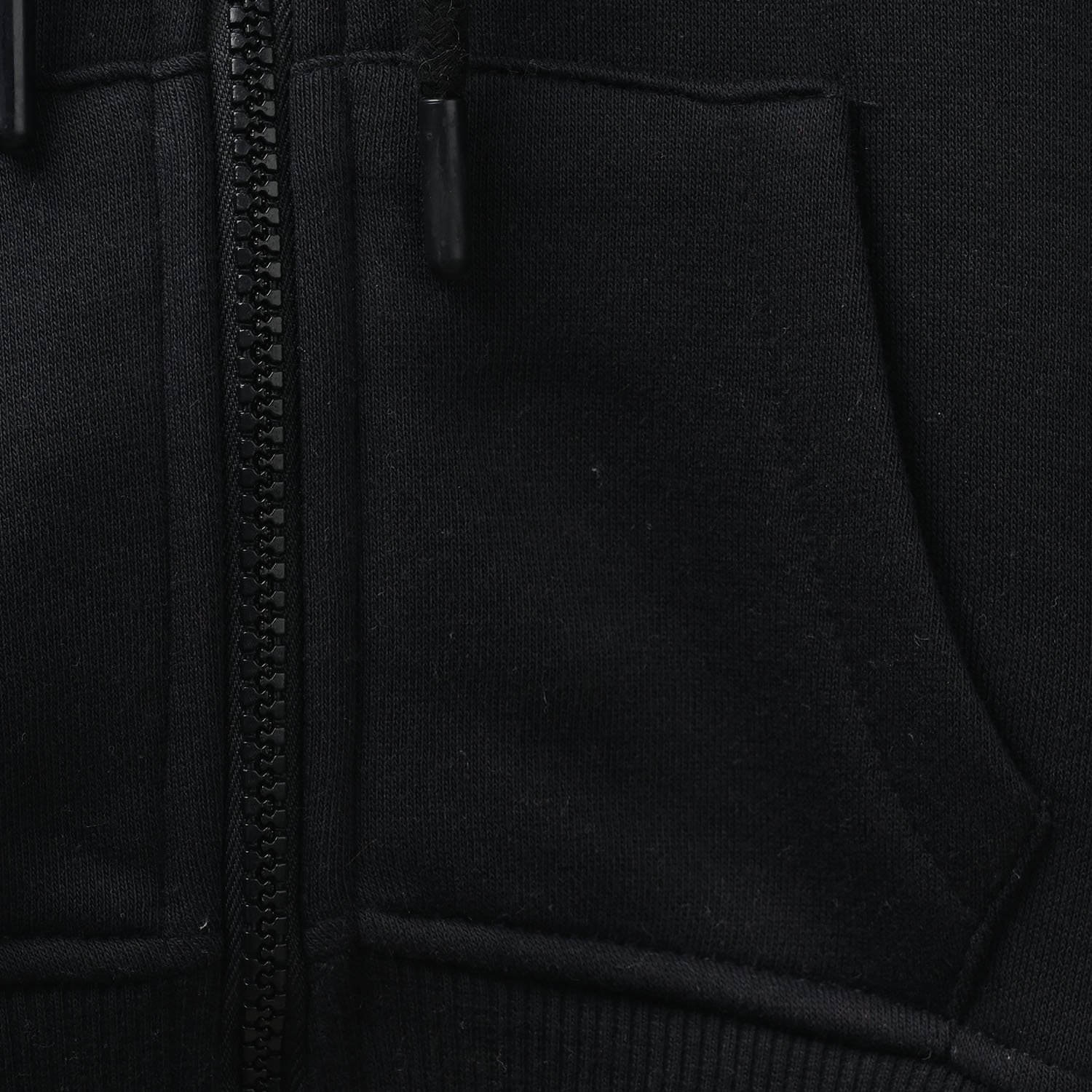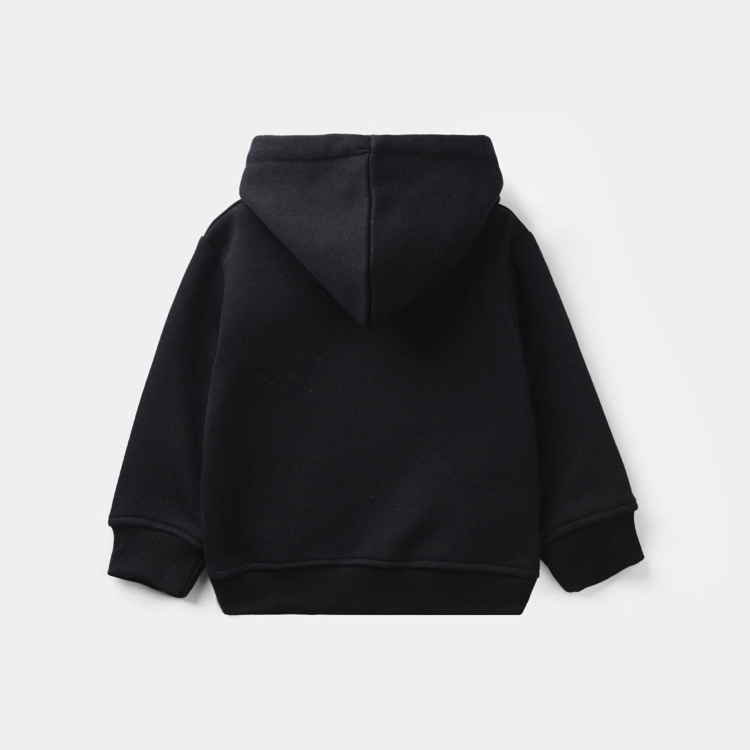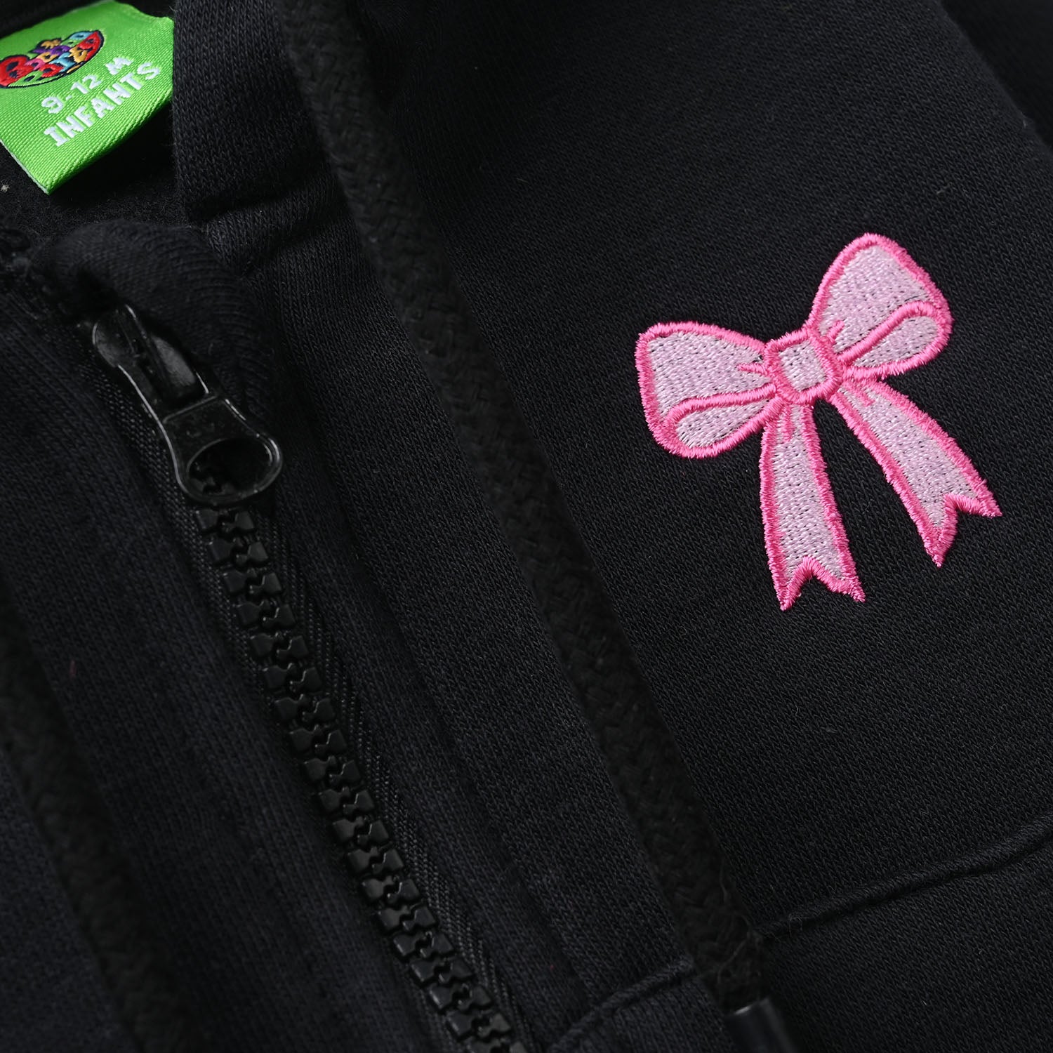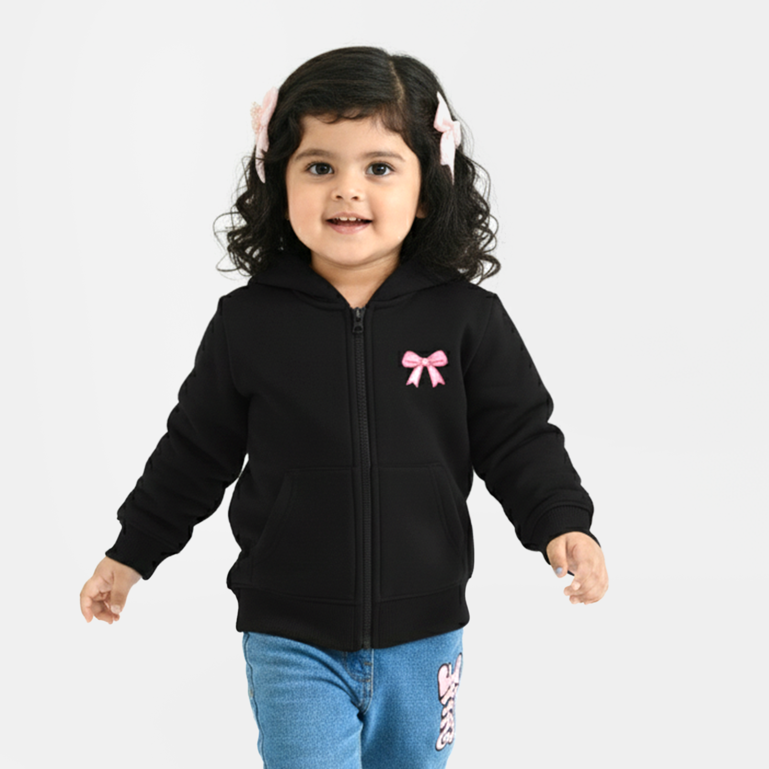 Girls black hoodie featuring a zipper front, attached hood, full sleeves, pockets, and delicate bow embroidery for a cute and cozy look.