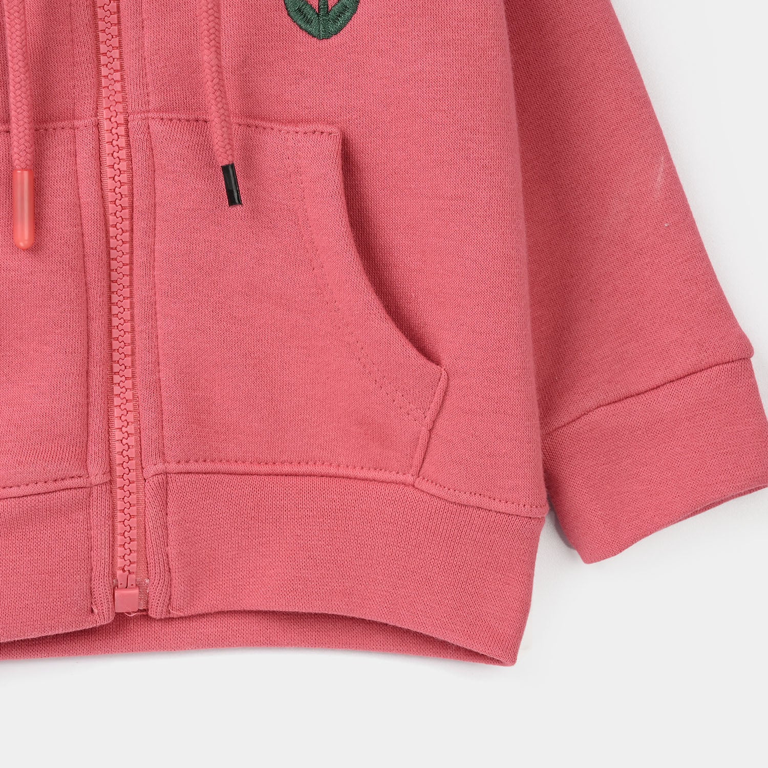 Girls pink hoodie featuring a zipper front, attached hood, full sleeves, pockets, and delicate floral embroidery for a cute and cozy look.