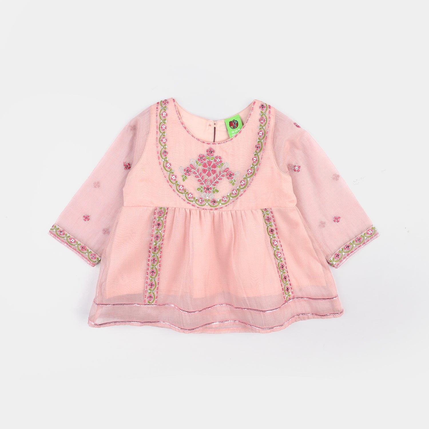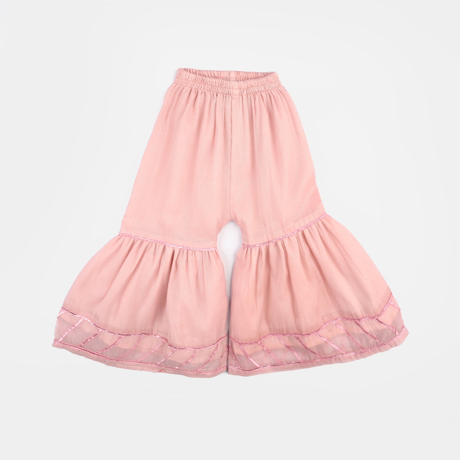 This pink girls eastern masoori 2-piece outfit features delicate embroidery on a frock-style shirt with a lace-finished hem and full sleeves. It comes with a matching gharara adorned with lace and lining for a charming traditional look.