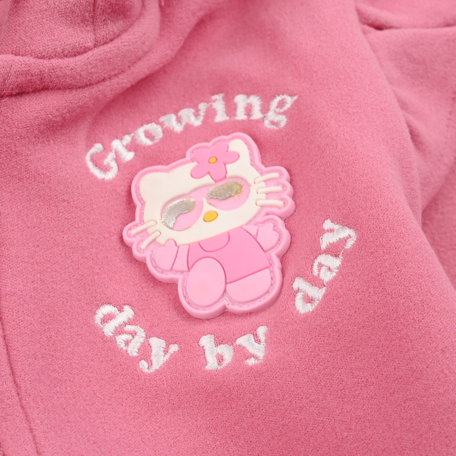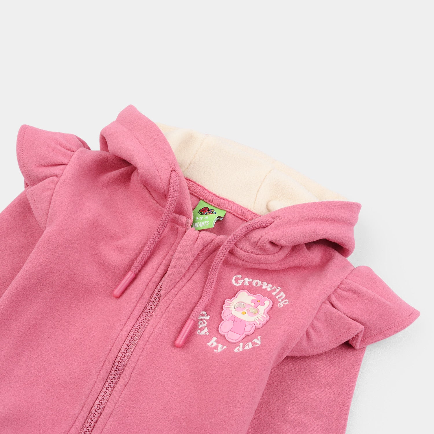 Pink velour jacket featuring a zipper closure, attached hood, full sleeves, ruffle detailing on the shoulders, and a Hello Kitty embellishment.