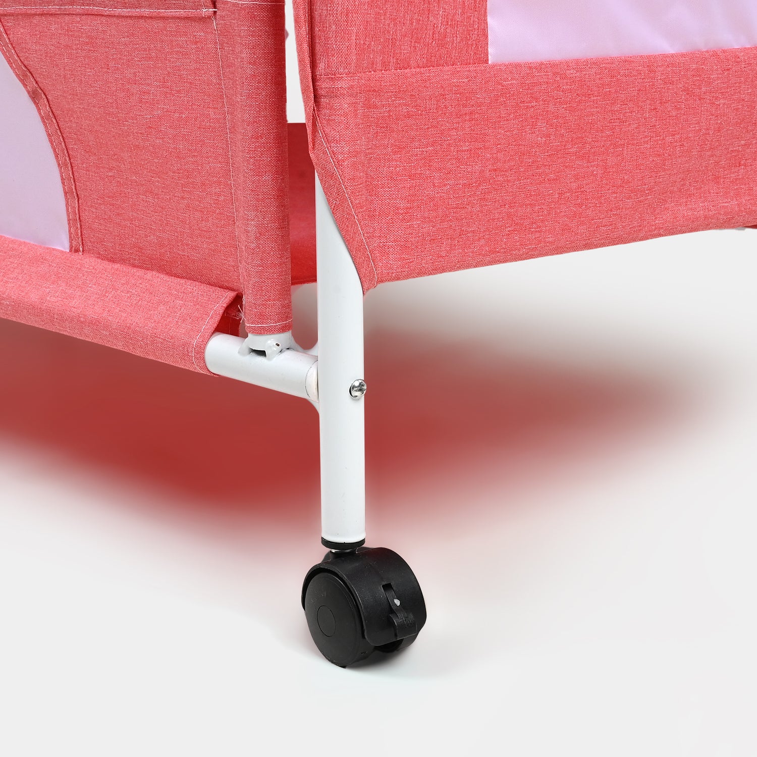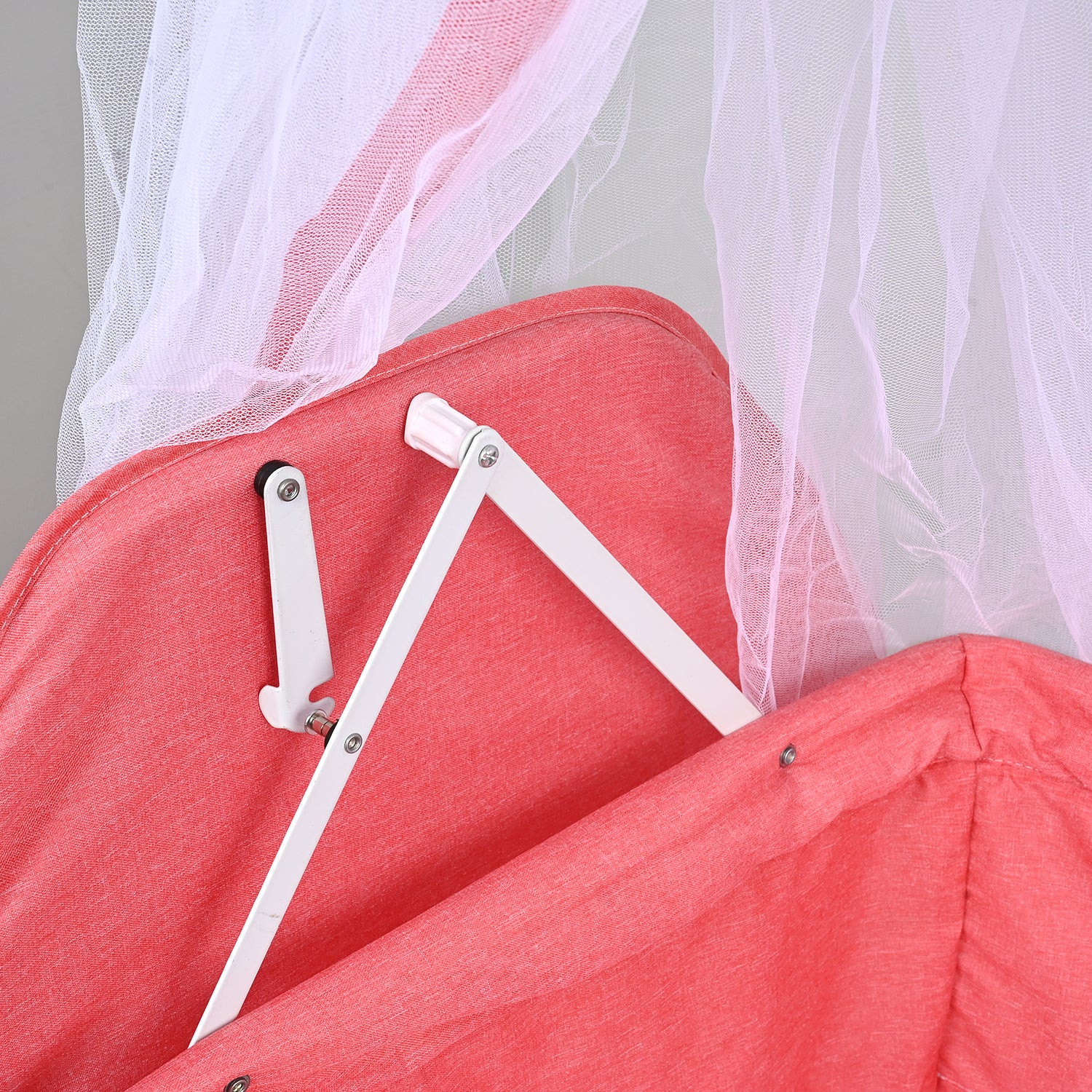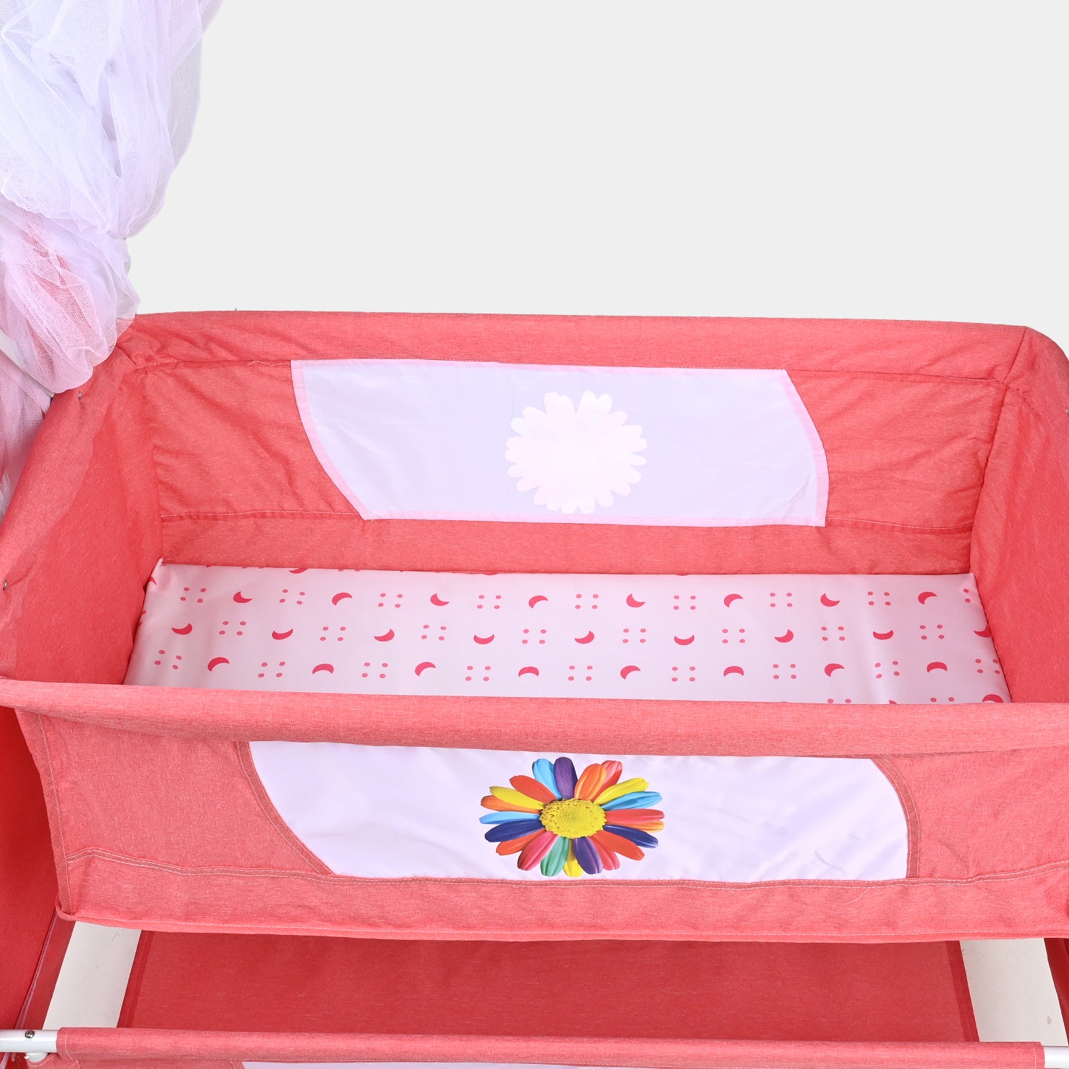 This beautiful baby cradle is designed to give your little one a cozy and secure sleeping environment. Featuring a soft fabric body with a colorful floral design, it includes a protective mosquito net to keep your baby safe from insects. The cradle has smooth rolling wheels for easy movement and a sturdy metal frame for durability. Perfect for newborns to sleep peacefully in comfort and safety.